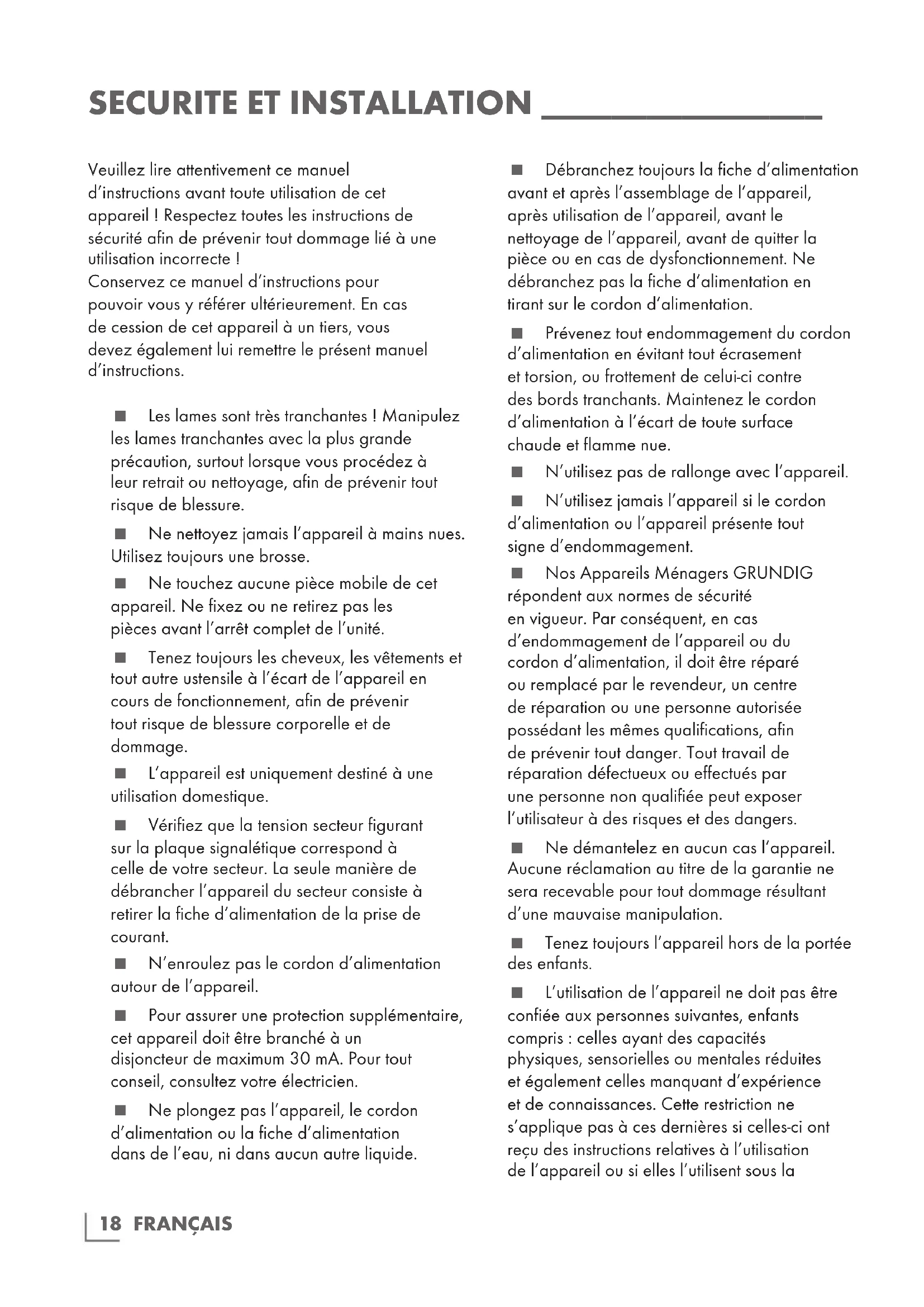 Veuillez lire attentivement ce manuel d’instructions avant toute utilisation de cet appareil ! Respectez toutes les instructions de sécurité afin de prévenir tout dommage lié à une utilisation incorrecte ! Conservez ce manuel d’instructions pour pouvoir vous y référer ultérieurement. En cas de cession de cet appareil à un tiers, vous devez également lui remettre le présent manuel d’instructions. Les lames sont très tranchantes ! Manipulez les lames tranchantes avec la plus grande précaution, surtout lorsque vous pr océdez à leur retrait ou nettoyage, afin de prévenir tout risque de blessure. Ne nettoyez jamais l’appareil à mains nues. Utilisez toujours une brosse. Ne touchez aucune pièce mobile de cet appareil. Ne fixez ou ne retirez pas les pièces avant l’arrêt complet de l’unité. Tenez toujours les cheveux, les vêtements et tout autre ustensile à l’écart de l’appareil en cours de fonctionnement, afin de prévenir tout risque de blessure corporelle et de dommage. L’appareil est uniquement destiné à une utilisation domestique. Vérifiez que la tension secteur figurant sur la plaque signalétique correspond à celle de votre secteur. La seule manière de débrancher l’appareil du secteur consiste à retirer la fiche d’alimentation de la prise de courant. N’enroulez pas le cordon d’alimentation autour de l’appareil. Pour assurer une protection supplémentaire, cet appareil doit être branché à un disjoncteur de maximum 30 mA. Pour tout conseil, consultez votre électricien. Ne plongez pas l’appareil, le cordon d’alimentation ou la fiche d’alimentation dans de l’eau, ni dans aucun autre liquide. Débranchez toujours la fiche d’alimentation avant et après l’assemblage de l’appareil, après utilisation de l’appareil, avant le netto yage de l’appareil, avant de quitter la pièce ou en cas de dysfonctionnement. Ne débranchez pas la fiche d’alimentation en tirant sur le cordon d’alimentation. Prévenez tout endommagement du cordon d’alimentation en évitant tout écrasement et torsion, ou frottement de celui-ci contre des bords tranchants. Maintenez le cor don d’alimentation à l’écart de toute surface chaude et flamme nue. N’utilisez pas de rallonge avec l’appareil. N’utilisez jamais l’appareil si le cordon d’alimentation ou l’appareil présente tout signe d’endommagement. Nos Appareils Ménagers GRUNDIG répondent aux normes de sécurité en vigueur. Par conséquent, en cas d’endommagement de l’appareil ou du cordon d’alimentation, il doit être réparé ou remplacé par le revendeur, un centre de réparation ou une personne autorisée possédant les mêmes qualifications, afin de prévenir tout danger. Tout travail de réparation défectueux ou effectués par une personne non qualifiée peut exposer l’utilisateur à des risques et des dangers. Ne démantelez en aucun cas l’appareil. Aucune réclamation au titre de la garantie ne sera recevable pour tout dommage résultant d’une mauvaise manipulation. Tenez toujours l’appareil hors de la portée des enfants. L’utilisation de l’appareil ne doit pas être confiée aux personnes suivantes, enfants compris : celles ayant des capacités physiques, sensorielles ou mentales réduites et également celles manquant d’expérience et de connaissances. Cette restriction ne s’applique pas à ces dernières si celles-ci ont reçu des instructions relatives à l’utilisation de l’appareil ou si elles l’utilisent sous la 18FRANÇAIS surveillance d’une personne responsable de leur sécurité. Surveillez toujours vos enfants afin de vous assurer que ceux-ci ne jouent pas avec l’appareil. Ne laissez pas l’appareil sans surveillance lorsqu’il est en cours de fonctionnement. La plus grande prudence est de mise lorsque l’appareil est utilisé en pr ésence d’enfants et de personnes ayant des capacités physiques, sensorielles ou mentales réduites. Avant la première utilisation de l’appareil, nettoyez soigneusement toutes les pièces qui entrent en contact avec les aliments. Veuillez consulter la section « Nettoyage et entretien » pour obtenir de plus amples détails. Séchez l’appareil et toutes les pièces avant de le brancher au secteur et de fixer les accessoires. N’utilisez pas l’appareil sans ingrédients dans le pot de mesure ou le hachoir. Ne disposez jamais l’appareil, les accessoires, le cordon d’alimentation ou la fiche d’alimentation sur une surface chaude telle qu’une cuisinière à gaz ou électrique, un four chauffé ou des liquides et aliments chauds. Laissez refroidir les aliments et liquides chauds jusqu’à 80°C ou une température inférieure, avant toute utilisation. N’utilisez pas cet appareil à d’autres fins que celles prévues. Ne mettez jamais l’appareil sous tension plus longtemps que nécessaire pour préparer les aliments. N’utilisez pas l’appareil lorsque vos mains sont mouillées. Utilisez l’appareil uniquement avec les pièces livrées. L’appareil est conçu pour traiter uniquement des quantités d’aliments domestiques ordinaires. N’utilisez pas l’appareil si les lames sont endommagées ou présentent des signes d’usure. Utilisez toujours l’appareil sur une surface nivelée, stable, propre et sèche. Assurez-v ous que le cordon d’alimentation ne risque pas d’être tiré accidentellement ou que personne ne risque de trébucher dessus lorsque l’appareil est en cours de fonctionnement. Positionnez l’appareil de sorte que la fiche d’alimentation soit toujours accessible. Vous pouvez utiliser une spatule pour retirer les aliments du pot de mesure ou du bol à hacher. Pour ce faire, l’appareil doit être mis hors tension. Cet appar eil n’est pas approprié pour broyer de la glace ou pour des aliments durs et secs car les lames s’émousseraient rapidement. Afin de prévenir tout endommagement des lames ou de l’appareil, retirez tous les os e