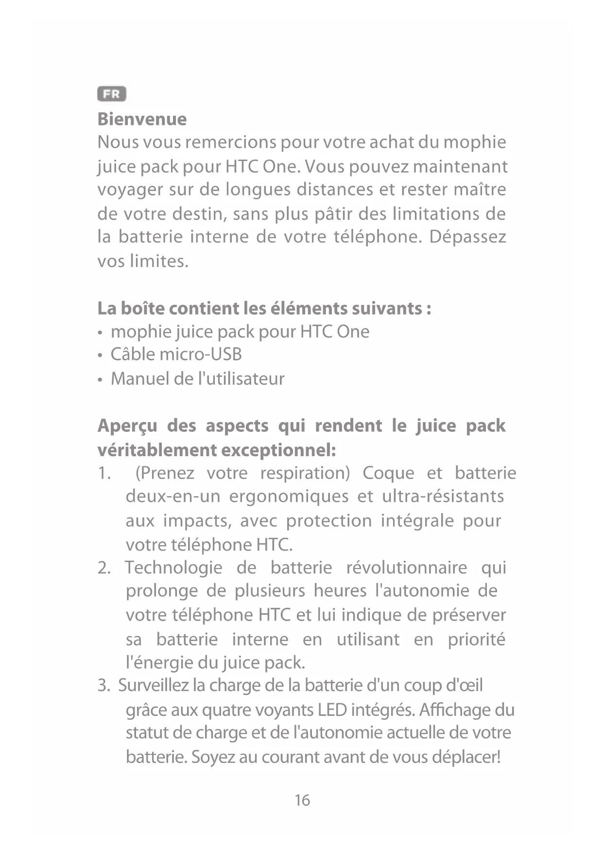 Nous vous remercions pour votre achat du mopathie juice pack pour HTC One. Vous pouvez maintainant voyager sur de longues distances et rester maître de votre destin, sans plus pâtir des limitations de la batterie interne de votre téléphone. Dépassez vos limites.
