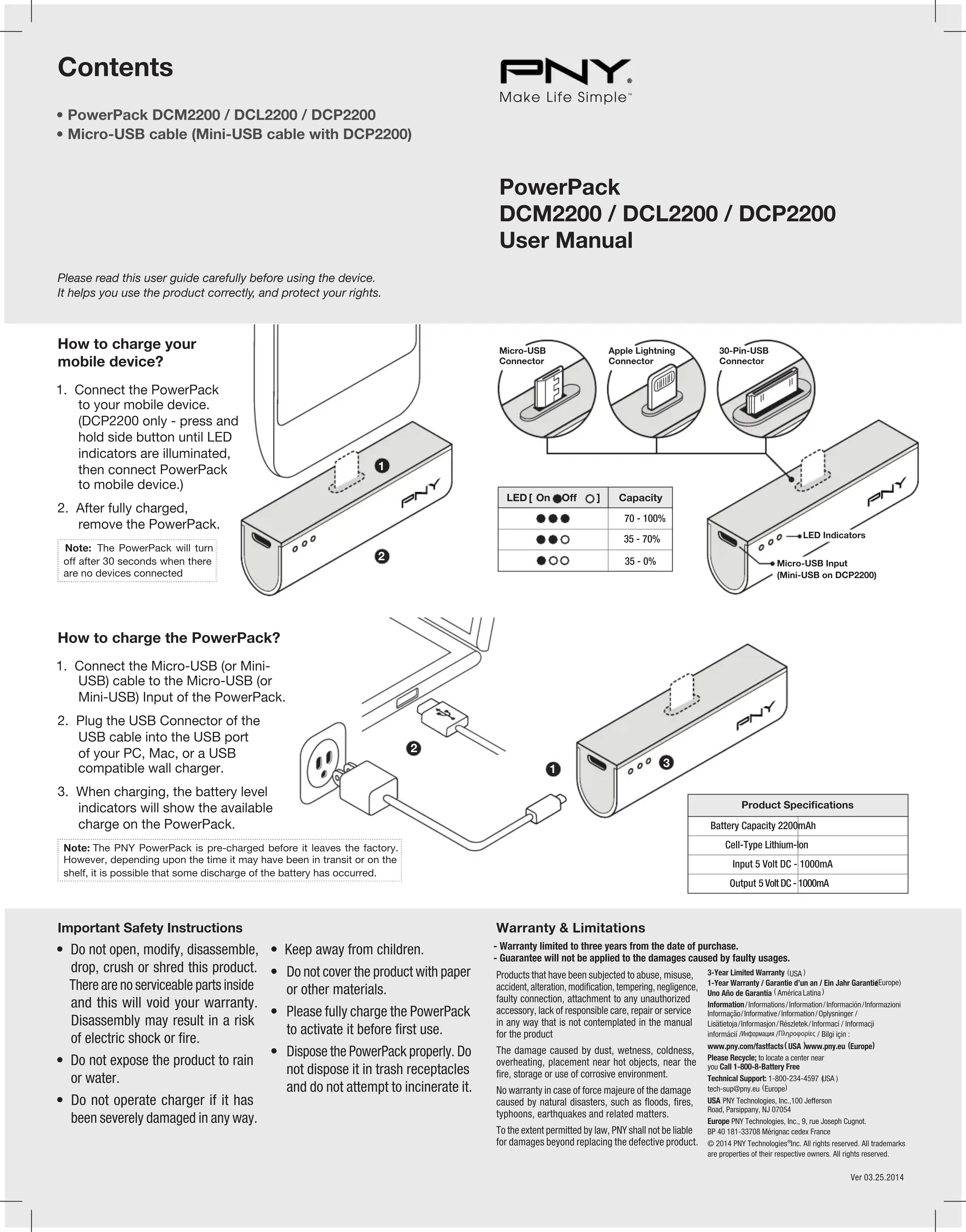 Téléchargez la notice de votre Batterie portable au format PDF gratuitement ! Retrouvez votre notice PowerPack DCP2200 - PNY et reprennez votre appareil électronique en main. Sur cette page sont publiés tous les documents nécessaires à l'utilisation de votre appareil PowerPack DCP2200 de la marque PNY.