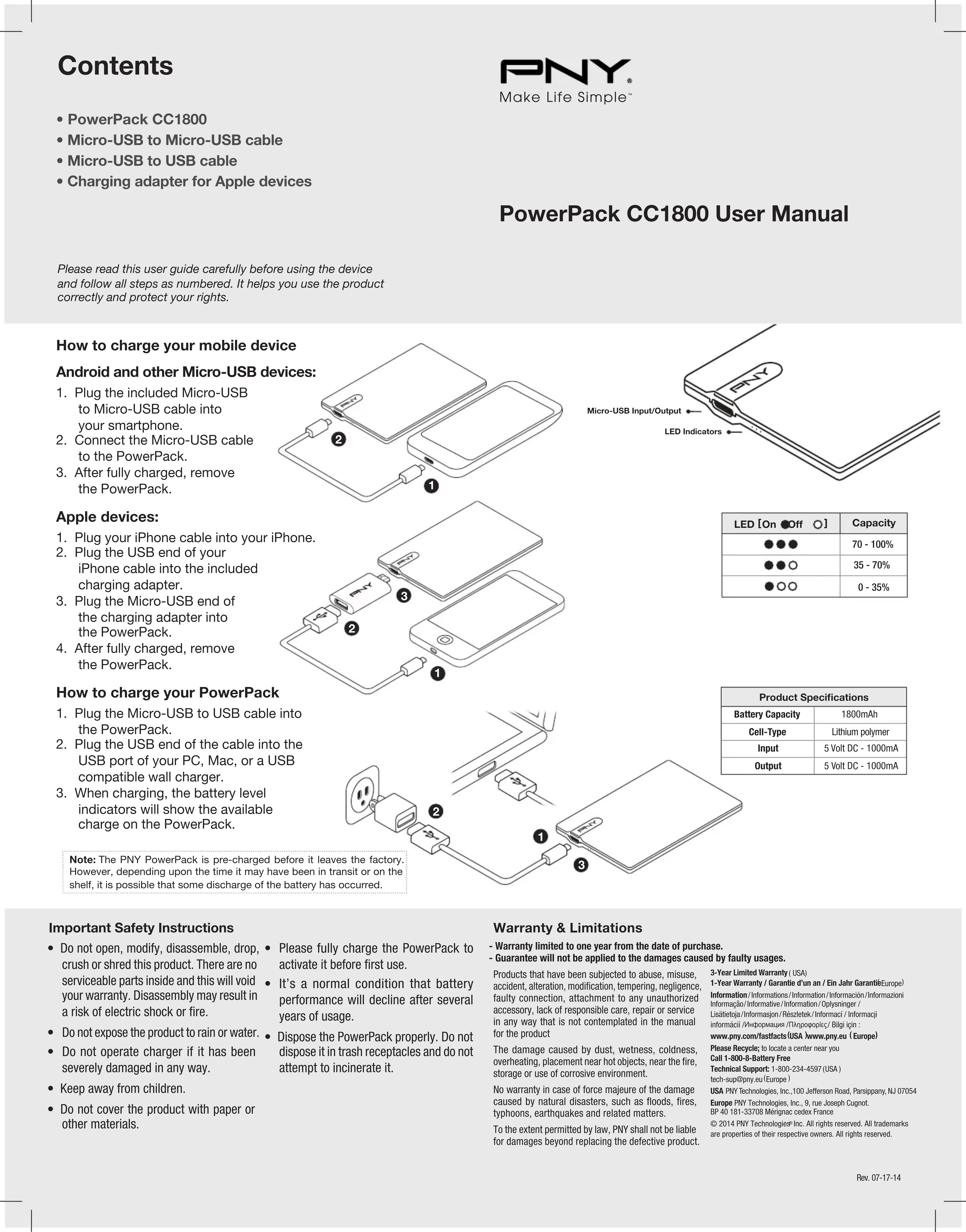 Téléchargez la notice de votre Batterie portable au format PDF gratuitement ! Retrouvez votre notice PowerPack CC1800 - PNY et reprennez votre appareil électronique en main. Sur cette page sont publiés tous les documents nécessaires à l'utilisation de votre appareil PowerPack CC1800 de la marque PNY.