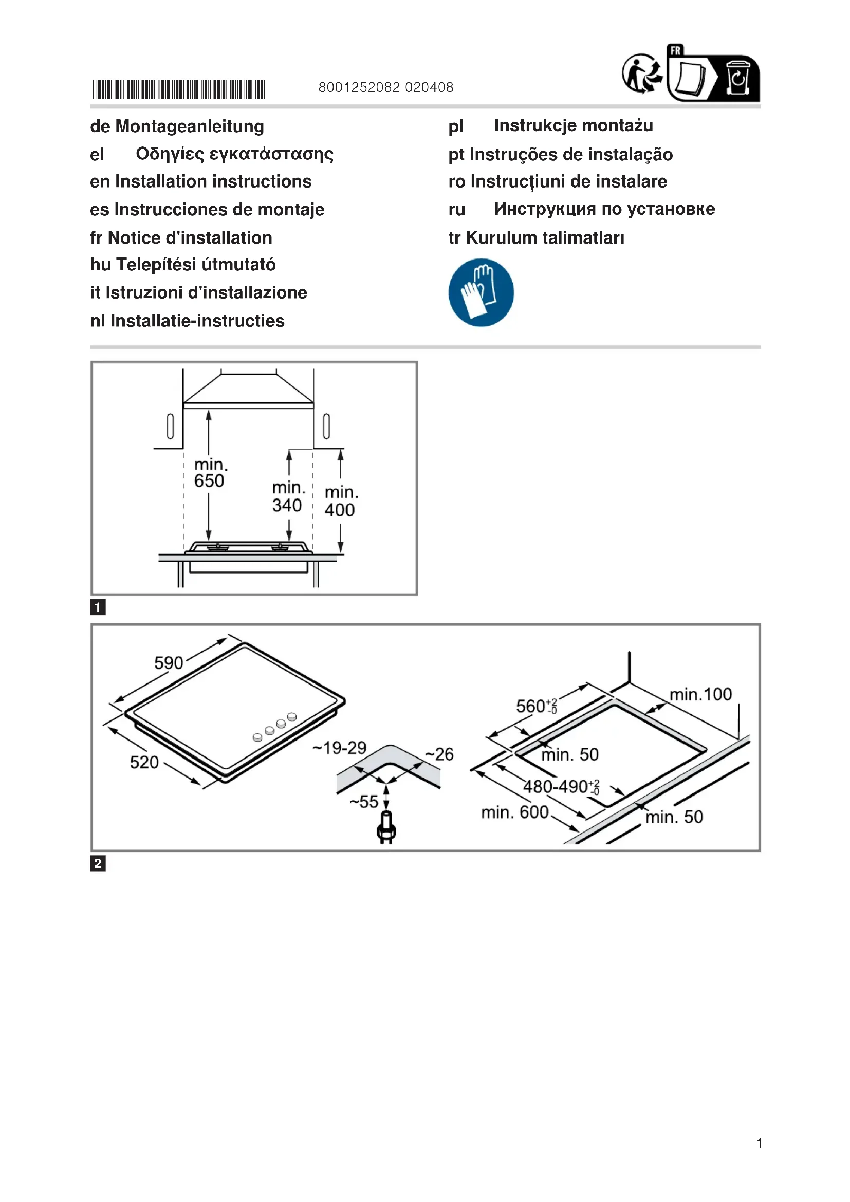 ¡ Veillez à une ventilation suffisante de la cuisine, notamment lorsque vous utilisez l’appareil de cuis- son au gaz. ¡ Ne raccordez pas l'appareil à un système d'éva- cuation des produits de combustion. ¡ Ne placez jamais cet appareil dans un bateau ou un véhicule. ¡ La garantie s'applique uniquement si l'appareil est utilisé conformément à sa destination. ¡ Avant d'installer l'appareil, vérifiez que les condi- tions locales du fournisseur sont compatibles avec les réglages de l'appareil indiqués sur la plaque signalétique (type et pression de gaz, puis- sance, tension). ¡ Fixez le cordon d'alimentation au boîtier pour évi- ter qu'il ne touche les parties chaudes du four ou de la table de cuisson. ¡ Avant toute intervention sur l'appareil, coupez l'ali- mentation électrique et l'arrivée de gaz. ¡ Reliez les appareils avec l'alimentation à la terre. ¡ N'effectuez aucune modification à l'intérieur de l'appareil. Si nécessaire, contactez notre service après-vente technique. Avant l'installation ¡ Cet appareil correspond à la classe 3 de la norme EN 30-1-1 pour les appareils à gaz: appareil en- castrable. ¡ Le meuble dans lequel l'appareil est installé doit être fixé de manière appropriée et stable. ¡ Les meubles situés près de l'appareil, les pan- neaux stratifiés et la colle utilisée pour les fixer doivent être constitués de matériaux incombus- tibles et résistants à la chaleur. ¡ N'installez pas cet appareil sur un réfrigérateur, un lave-linge, un lave-vaisselle ni sur tout autre appa- reil similaire. ¡ Cet appareil doit être installé uniquement sur un four à ventilation forcée. Vérifiez les dimensions du four dans le manuel d'installation du four. ¡ Si vous installez un four sous la table de cuisson, l'épaisseur du plan de travail peut différer des di- mensions indiquées dans ces instructions. Res- pectez les consignes des instructions de montage du four. ¡ Si un ventilateur d'extraction ou une hotte aspi- rante est installé(e), suivez ses instructions d'ins- tallation. Respectez toujours la distance verticale minimale par rapport à la table de cuisson.