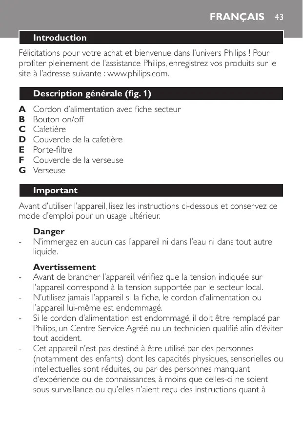 Danger -- N’immergez en aucun cas l’appareil ni dans l’eau ni dans tout autre liquide. Avertissement -- Avant de brancher l’appareil, vérifiez que la tension indiquée sur l’appareil correspond à la tension supportée par le secteur local. -- N’utilisez jamais l’appareil si la fiche, le cordon d’alimentation ou l’appareil lui-même est endommagé. -- Si le cordon d’alimentation est endommagé, il doit être remplacé par Philips, un Centre Service Agréé ou un technicien qualifié afin d’éviter tout accident. -- Cet appareil n’est pas destiné à être utilisé par des personnes (notamment des enfants) dont les capacités physiques, sensorielles ou intellectuelles sont réduites, ou par des personnes manquant d’expérience ou de connaissances, à moins que celles-ci ne soient sous surveillance ou qu’elles n’aient reçu des instructions quant à