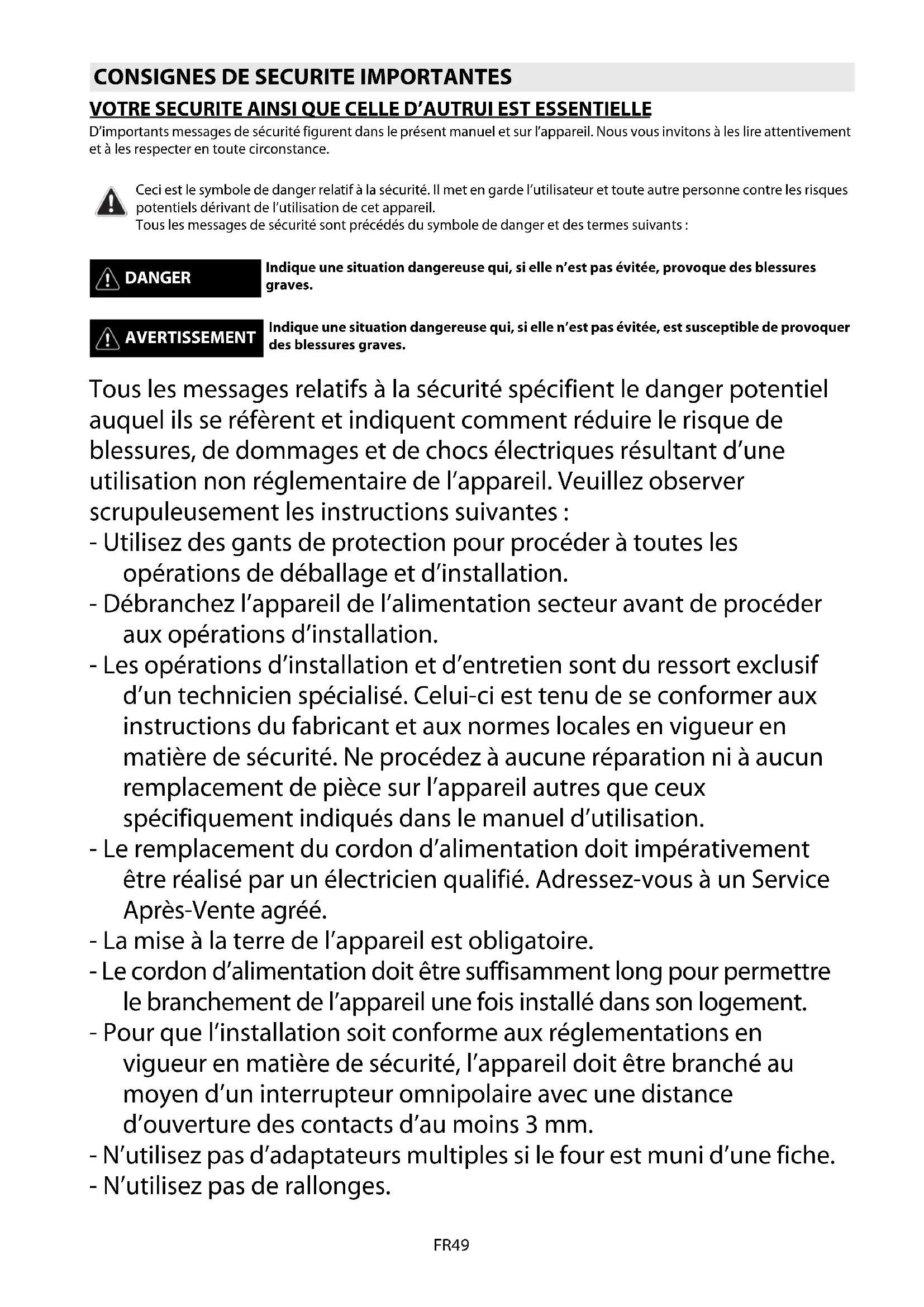 FR49 VOTRE SECURITE AINSI QUE CELLE D’AUTRUI EST ESSENTIELLE D’importants messages de sécurité figurent dans le présent manuel et sur l’appareil. Nous vous invitons à les lire attentivement et à les respecter en toute circonstance. Tous les messages relatifs à la sécurité spécifient le danger potentiel auquel ils se réfèrent et indiquent comment réduire le risque de blessures, de dommages et de chocs électriques résultant d’une utilisation non réglementaire de l’appareil. Veuillez observer scrupuleusement les instructions suivantes : - Utilisez des gants de protection pour procéder à toutes les opérations de déballage et d’installation. - Débranchez l’appareil de l’alimentation secteur avant de procéder aux opérations d’installation. - Les opérations d’installation et d’entretien sont du ressort exclusif d’un technicien spécialisé. Celui-ci est tenu de se conformer aux instructions du fabricant et aux normes locales en vigueur en matière de sécurité. Ne procédez à aucune réparation ni à aucun remplacement de pièce sur l’appareil autres que ceux spécifiquement indiqués dans le manuel d’utilisation. - Le remplacement du cordon d’alimentation doit impérativement être réalisé par un électricien qualifié. Adressez-vous à un Service Après-Vente agréé. - La mise à la terre de l’appareil est obligatoire. - Le cordon d’alimentation doit être suffisamment long pour permettre le branchement de l’appareil une fois installé dans son logement. - Pour que l’installation soit conforme aux réglementations en vigueur en matière de sécurité, l’appareil doit être branché au moyen d’un interrupteur omnipolaire avec une distance d’ouverture des contacts d’au moins 3 mm. - N’utilisez pas d’adaptateurs multiples si le four est muni d’une fiche. - N’utilisez pas de rallonges.