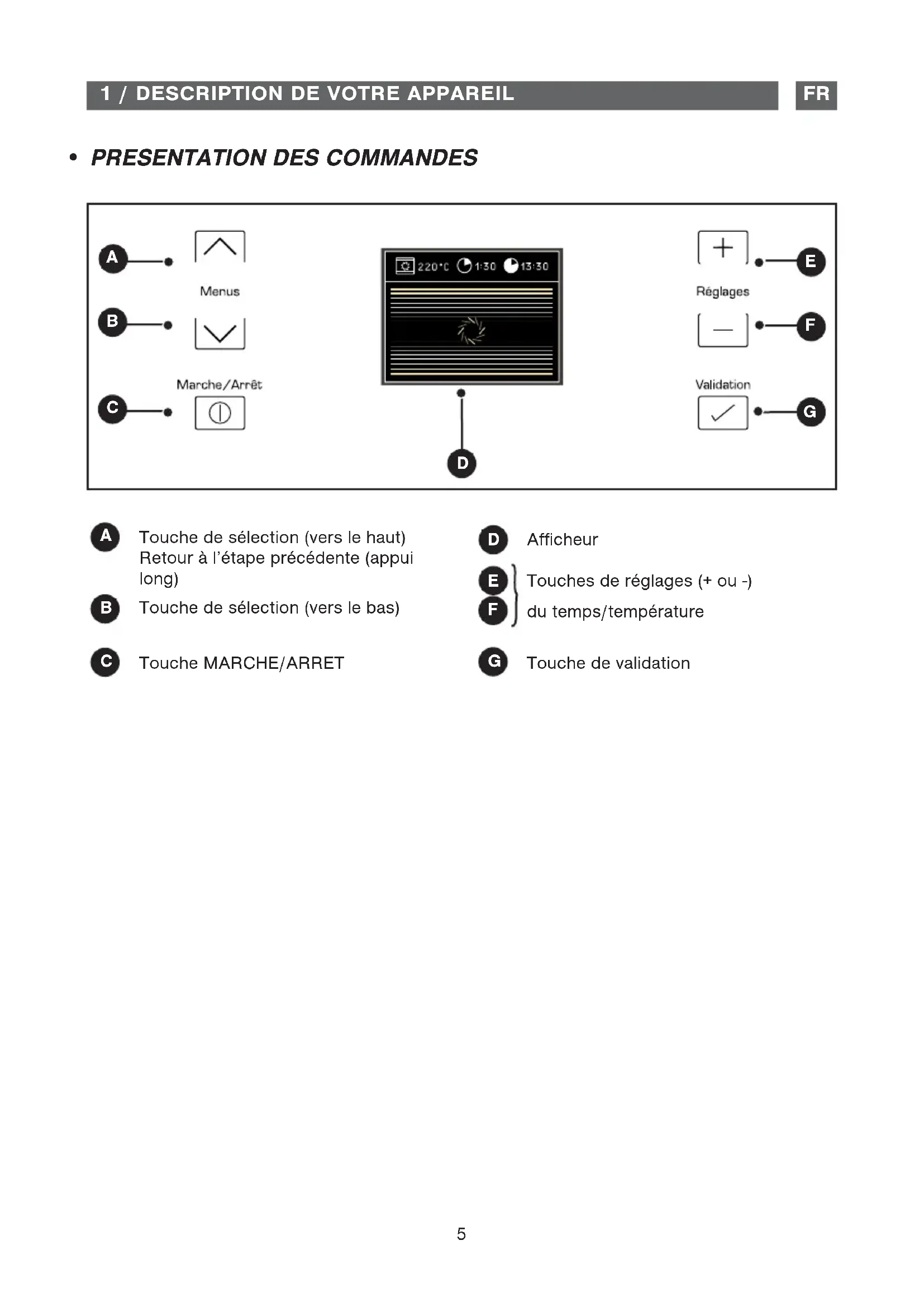 Afficheur Touches de réglages (+ ou -) du temps/température Touche de validation