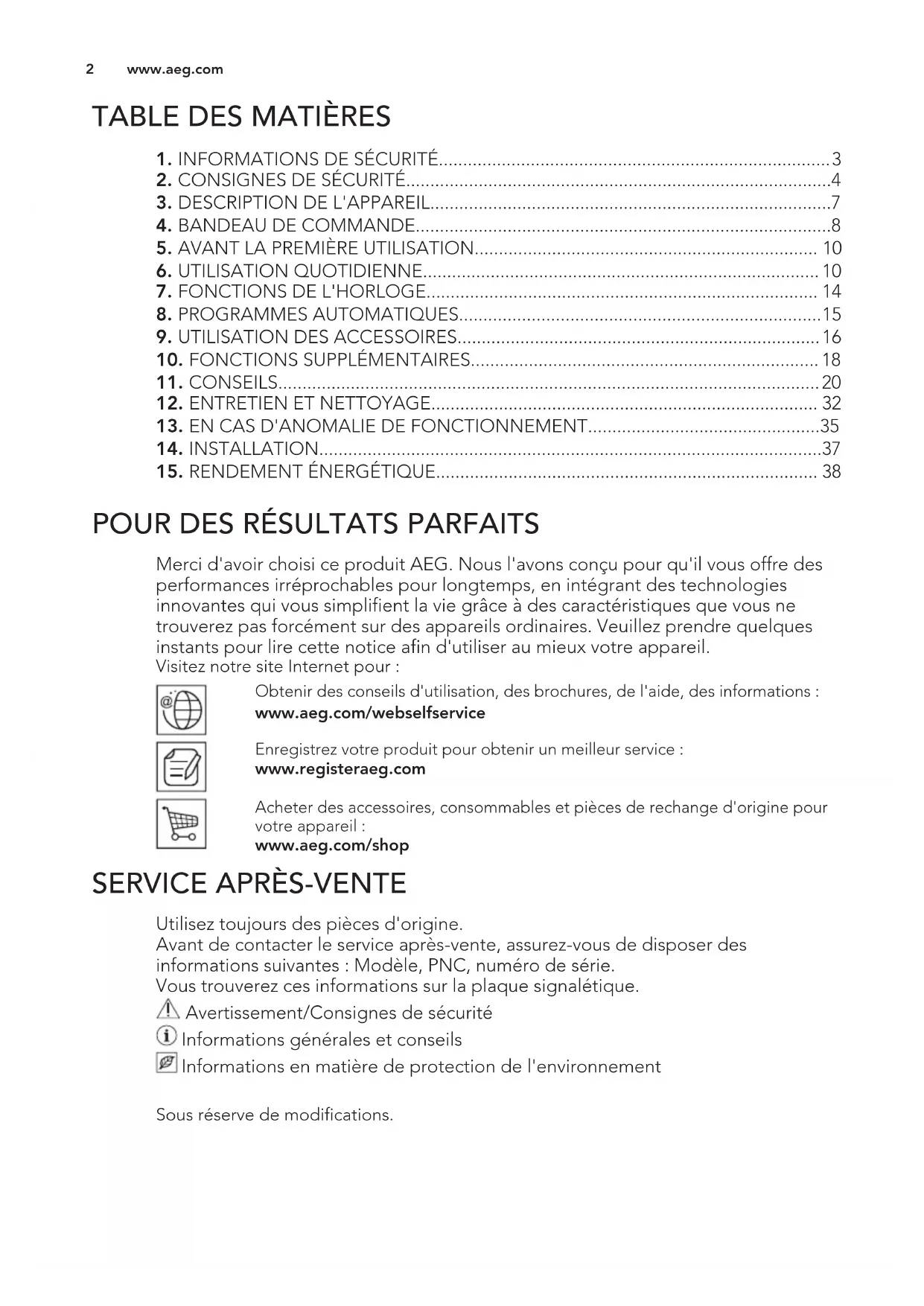 Merci d'avoir choisi ce produit AEG. Nous l'avons conçu pour qu'il vous offre des performances irréprochables pour longtemps, en intégrant des technologies innovantes qui vous simplifient la vie grâce à des caractéristiques que vous ne trouverez pas forcément sur des appareils ordinaires. Veuillez prendre quelques instants pour lire cette notice afin d'utiliser au mieux votre appareil. Visitez notre site Internet pour : Obtenir des conseils d'utilisation, des brochures, de l'aide, des informations : www.aeg.com/webselfservice Enregistrez votre produit pour obtenir un meilleur service : www.registeraeg.com Acheter des accessoires, consommables et pièces de rechange d'origine pour votre appareil : www.aeg.com/shop