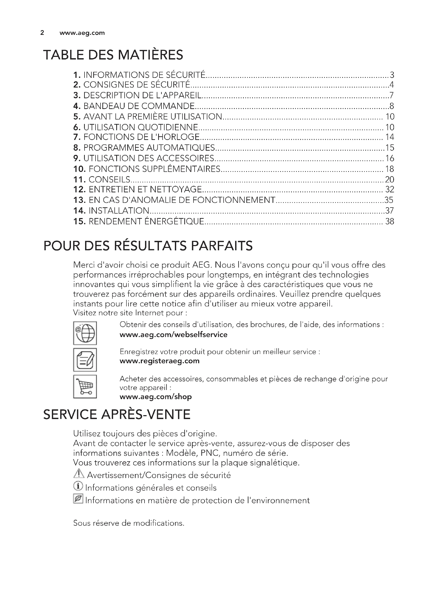 Merci d'avoir choisi ce produit AEG. Nous l'avons conçu pour qu'il vous offre des performances irréprochables pour longtemps, en intégrant des technologies innovantes qui vous simplifient la vie grâce à des caractéristiques que vous ne trouverez pas forcément sur des appareils ordinaires. Veuillez prendre quelques instants pour lire cette notice afin d'utiliser au mieux votre appareil. Visitez notre site Internet pour : Obtenir des conseils d'utilisation, des brochures, de l'aide, des informations : www.aeg.com/webselfservice Enregistrez votre produit pour obtenir un meilleur service : www.registeraeg.com Acheter des accessoires, consommables et pièces de rechange d'origine pour votre appareil : www.aeg.com/shop