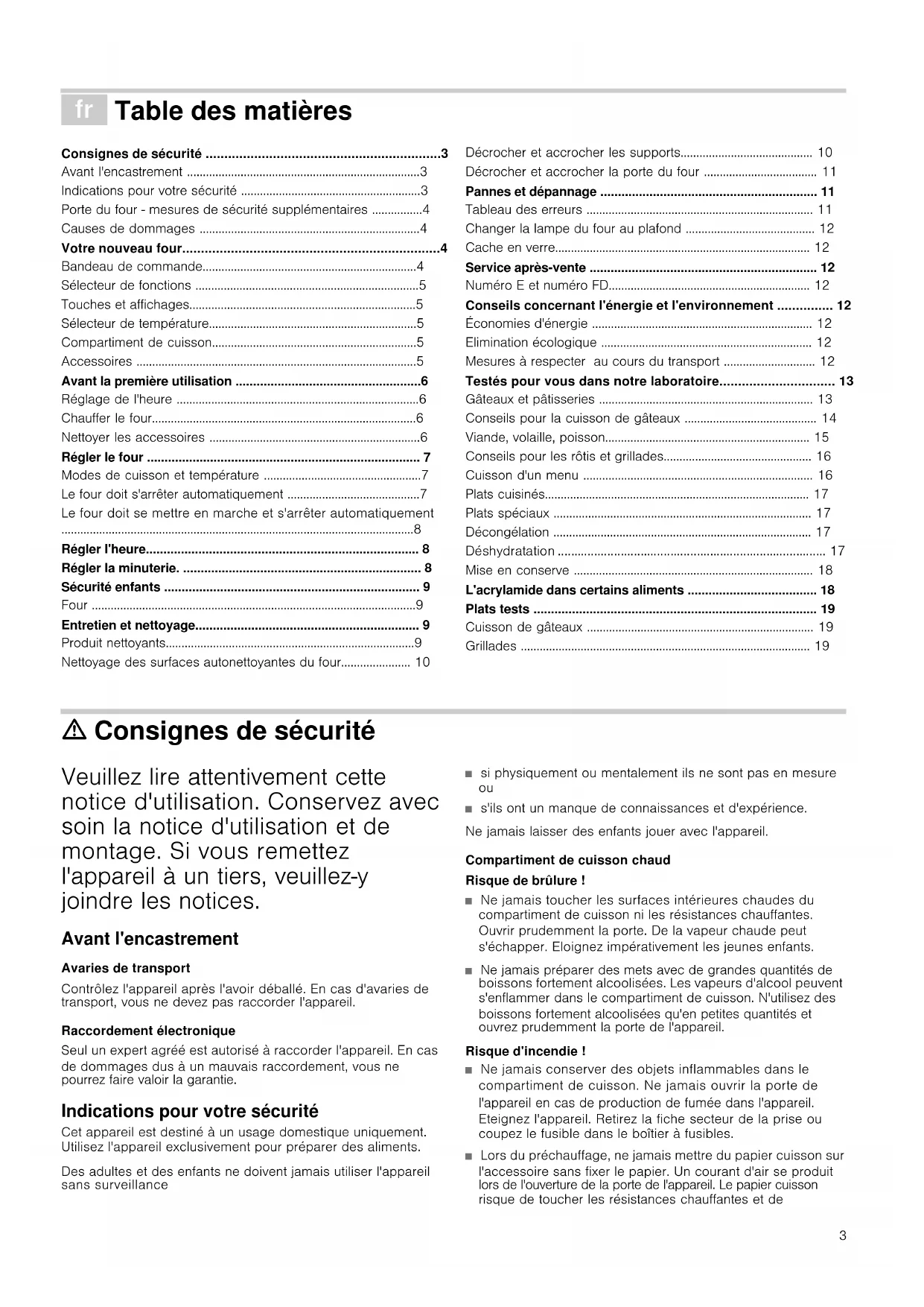 - Grillades ã=Consignes de sécurité Veuillez lire attentivement cette notice d'utilisation. Conservez avec soin la notice d'utilisation et de montage. Si vous remettez l'appareil à un tiers, veuillez-y joindre les notices. Avant l'encastrement Avaries de transport Contrôlez l'appareil après l'avoir déballé. En cas d'avaries de transport, vous ne devez pas raccorder l'appareil. Raccordement électronique Seul un expert agréé est autorisé à raccorder l'appareil. En cas de dommages dus à un mauvais raccordement, vous ne pourrez faire valoir la garantie. Indications pour votre sécurité Cet appareil est destiné à un usage domestique uniquement. Utilisez l'appareil exclusivement pour préparer des aliments. Des adultes et des enfants ne doivent jamais utiliser l'appareil sans surveillance ■ si physiquement ou mentalement ils ne sont pas en mesure ■ s'ils ont un manque de connaissances et d'expérience. Ne jamais laisser des enfants jouer avec l'appareil. Compartiment de cuisson chaud Risque de brûlure ! ■ Ne jamais toucher les surfaces intérieures chaudes du compartiment de cuisson ni les résistances chauffantes. Ouvrir prudemment la porte. De la vapeur chaude peut s'échapper. Eloignez impérativement les jeunes enfants. ■ Ne jamais préparer des mets avec de grandes quantités de boissons fortement alcoolisées. Les vapeurs d'alcool peuvent s'enflammer dans le compartiment de cuisson. N'utilisez des boissons fortement alcoolisées qu'en petites quantités et ouvrez prudemment la porte de l'appareil. Risque d'incendie ! ■ Ne jamais conserver des objets inflammables dans le compartiment de cuisson. Ne jamais ouvrir la porte de l'appareil en cas de production de fumée dans l'appareil. Eteignez l'appareil. Retirez la fiche secteur de la prise ou coupez le fusible dans le boîtier à fusibles. ■ Lors du préchauffage, ne jamais mettre du papier cuisson sur l'accessoire sans fixer le papier. Un courant d'air se produit lors de l'ouverture de la porte de l'appareil. Le papier cuisson risque de toucher les résistances chauffantes et de4 s'enflammer. Alourdissez toujours le papier cuisson avec un récipient ou un moule. Garnissez toujours la surface nécessaire de papier cuisson. Le papier cuisson ne doit pas dépasser de l'accessoire. Risque de court-circuit ! Ne coincez jamais le cordon de raccordement d'un appareil électrique dans la porte chaude de l'appareil. L'isolation du câble risque de fondre. Risque de s'ébouillanter ! Ne jamais verser de l'eau dans le compartiment de cuisson chaud. Cela produit de la vapeur d'eau chaude. Accessoires et récipients chauds Risque de brûlure ! Utilisez toujours des maniques pour retirer des accessoires ou des récipients chauds du compartiment de cuisson. Réparations inexpertes Risque de choc électrique ! Les réparations inexpertes sont dangereuses. Seul un technicien du service après-vente formé par nos soins est habilité à effectuer des réparations. Si l'appareil est défectueux, retirez la fiche de la prise de secteur ou coupez le fusible dans le boîtier à fusibles. Appelez le service aprèsvente. Porte du four - mesures de sécurité supplémentaires La porte du four peut devenir très chaude en cas de temps de cuisson longs. Si vous avez des enfants en bas âge, il faut redoubler d'attention lors de l'utilisation du four. Il existe pour cela un dispositif de protection qui empêche un contact direct avec la porte du four. Cet accessoire vendu séparément (440651) est disponible auprès du service après- vente. Causes de dommages Attention ! ■ Accessoires, feuille, papier cuisson ou récipient sur le fond du compartiment de cuisson : Ne posez pas d'accessoires sur le fond du compartiment de cuisson. Ne recouvrez pas le fond du compartiment de cuisson d'une feuille, quel que soit le type, ni de papier cuisson. Ne placez pas de récipient sur le fond du compartiment de cuisson si vous avez réglé une température supérieure à 50 °C. Cela crée une accumulation de chaleur. Les temps de cuisson ne correspondent plus et l'émail sera endommagé. ■ Eau dans le compartiment de cuisson chaud : Ne versez jamais d'eau dans le compartiment de cuisson chaud. Cela produit de la vapeur d'eau. Le changement de température peut occasionner des dommages sur l'émail. ■ Aliments humides : Ne conservez pas d'aliments humides dans le compartiment de cuisson pendant une longue durée. Cela endommage l'émail. ■ Jus de fruits : Ne garnissez pas trop la plaque à pâtisserie en cas de gâteaux aux fruits très juteux. Le jus de fruits qui goutte de la plaque laisse des taches définitives. Utilisez de préférence la lèchefrite à bords hauts. ■ Refroidissement la porte de l'appareil ouverte : Laissez refroidir le compartiment de cuisson uniquement la porte fermée. Même si la porte de l'appareil n'est qu'entrouverte, les façades des meubles voisins risquent d'être endommagées au fil du temps. ■ Joint du four très encrassé : Si le joint du four est très encrassé, la porte du four ne fermera plus correctement lors du fonctionnement. Les façades des meubles voisins risquent d'être endommagées. Veillez à ce que le joint du four soit toujours propre. ■ Porte du four utilisée comme surface d'assise ou support : Il est interdit de grimper ou de s'asseoir sur la porte du four ouverte. Ne déposez pas de récipient ou d'accessoires sur la porte du four. ■ Transporter l'appareil : Ne transportez ou ne portez pas l'appareil par la poignée de la porte. La poignée ne supportera pas le poids de l'appareil et risque de se casser. Votre nouveau four Vous apprenez ici à connaître votre nouveau four. Nous vous expliquons le bandeau de commande et les différents éléments de commande. Vous obtenez des informations concernant le compartiment de cuisson et les accessoires. Bandeau de commande Différentes versions sont disponibles selon le type d'appareil. p. 19