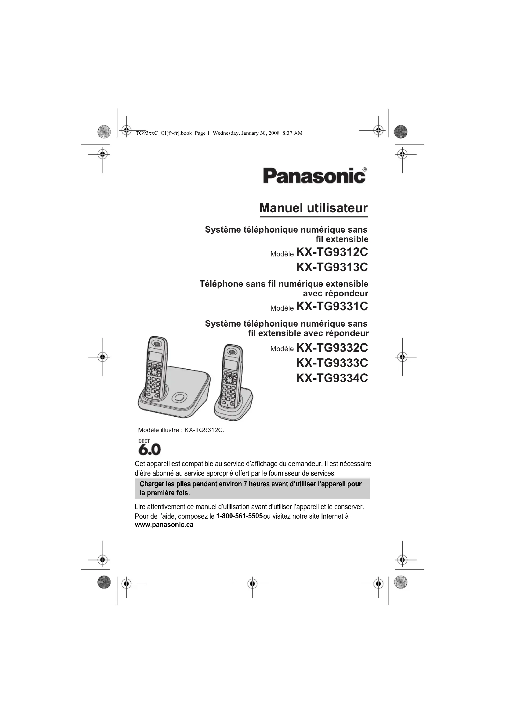 Cet appareil est compatible au service d’affichage du demandeur. Il est nécessaire d’être abonné au service approprié offert par le fournisseur de services.Lire attentivement ce manuel d’utilisation avant d’utiliser l’appareil et le conserver.Pour de l’aide, composez le 1-800-561-5505 ou visitez notre site Internet à www.panasonic.caCharger les piles pendant environ 7 heures avant d’utiliser l’appareil pour la première fois. Manuel utilisateur Modèle illustré : KX-TG9312C. Téléphone sans fil numérique extensible avec répondeur Modèle KX-TG9331C fil extensible avec répondeur Modèle KX-TG9332C KX-TG9333C KX-TG9334C Système téléphonique numérique sans fil extensible Modèle KX-TG9312C KX-TG9313C Système téléphonique numérique sans TG93xxC_OI(fr-fr).book Page 1 Wednesday, January 30, 2008 8:37 AMSommaire