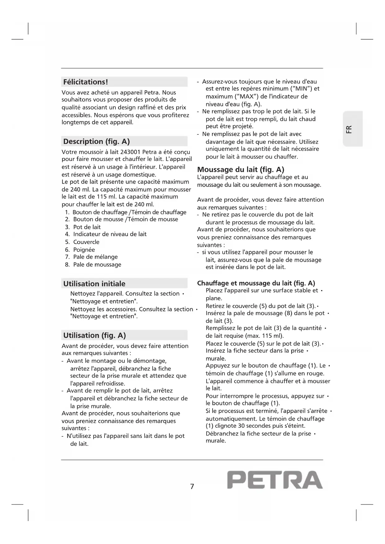 Félicitations! Vous avez acheté un appareil Petra. Nous souhaitons vous proposer des produits de qualité associant un design raffiné et des prix accessibles. Nous espérons que vous profiterez longtemps de cet appareil. Description (fig. A) Votre moussoir à lait 243001 Petra a été conçu pour faire mousser et chauffer le lait. L'appareil est réservé à un usage à l'intérieur. L'appareil est réservé à un usage domestique. Le pot de lait présente une capacité maximum de 240 ml. La capacité maximum pour mousser le lait est de 115 ml. La capacité maximum pour chauffer le lait est de 240 ml.