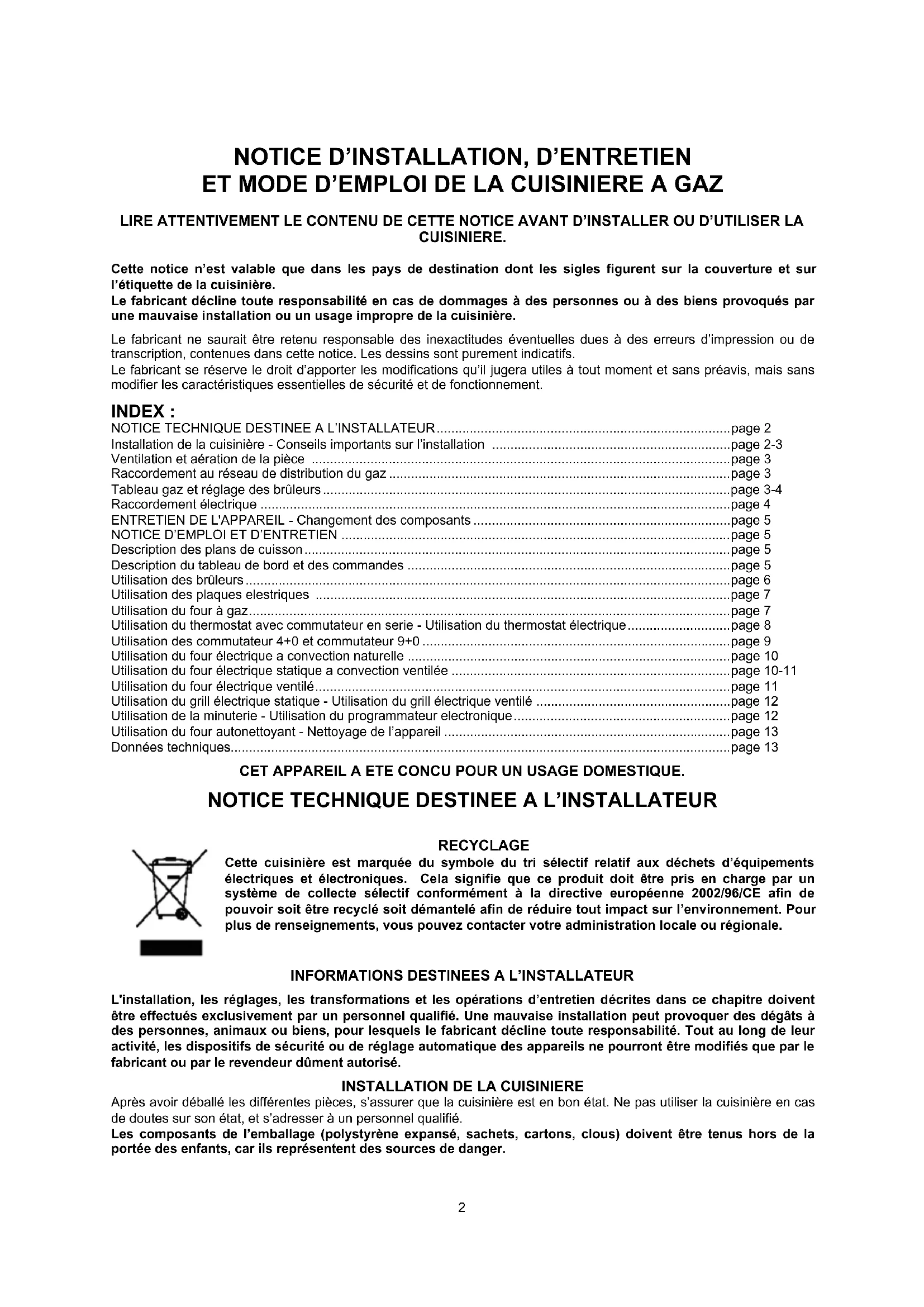 ET MODE D’EMPLOI DE LA CUISINIERE A GAZ LIRE ATTENTIVEMENT LE CONTENU DE CETTE NOTICE AVANT D’INSTALLER OU D’UTILISER LA CUISINIERE. Cette notice n’est valable que dans les pays de destination dont les sigles figurent sur la couverture et sur l’étiquette de la cuisinière. Le fabricant décline toute responsabilité en cas de dommages à des personnes ou à des biens provoqués par une mauvaise installation ou un usage impropre de la cuisinière. Le fabricant ne saurait être retenu responsable des inexactitudes éventuelles dues à des erreurs d’impression ou de transcription, contenues dans cette notice. Les dessins sont purement indicatifs. Le fabricant se réserve le droit d’apporter les modifications qu’il jugera utiles à tout moment et sans préavis, mais sans modifier les caractéristiques essentielles de sécurité et de fonctionnement. INDEX : NOTICE TECHNIQUE DESTINEE A L’INSTALLATEUR................................................................................page 2 Installation de la cuisinière - Conseils importants sur l’installation .................................................................page 2-3 Ventilation et aération de la pièce ..................................................................................................................page 3 Raccordement au réseau de distribution du gaz .............................................................................................page 3 Tableau gaz et réglage des brûleurs...............................................................................................................page 3-4 Raccordement électrique ................................................................................................................................page 4 ENTRETIEN DE L'APPAREIL - Changement des composants ......................................................................page 5 NOTICE D’EMPLOI ET D’ENTRETIEN ..........................................................................................................page 5 Description des plans de cuisson....................................................................................................................page 5 Description du tableau de bord et des commandes ........................................................................................page 5 Utilisation des brûleurs ....................................................................................................................................page 6 Utilisation des plaques elestriques .................................................................................................................page 7 Utilisation du four à gaz...................................................................................................................................page 7 Utilisation du thermostat avec commutateur en serie - Utilisation du thermostat électrique............................page 8 Utilisation des commutateur 4+0 et commutateur 9+0 ....................................................................................page 9 Utilisation du four électrique a convection naturelle ........................................................................................page 10 Utilisation du four électrique statique a convection ventilée ............................................................................page 10-11 Utilisation du four électrique ventilé.................................................................................................................page 11 Utilisation du grill électrique statique - Utilisation du grill électrique ventilé .....................................................page 12 Utilisation de la minuterie - Utilisation du programmateur electronique...........................................................page 12 Utilisation du four autonettoyant - Nettoyage de l’appareil ..............................................................................page 13 Données techniques........................................................................................................................................page 13 CET APPAREIL A ETE CONCU POUR UN USAGE DOMESTIQUE.
