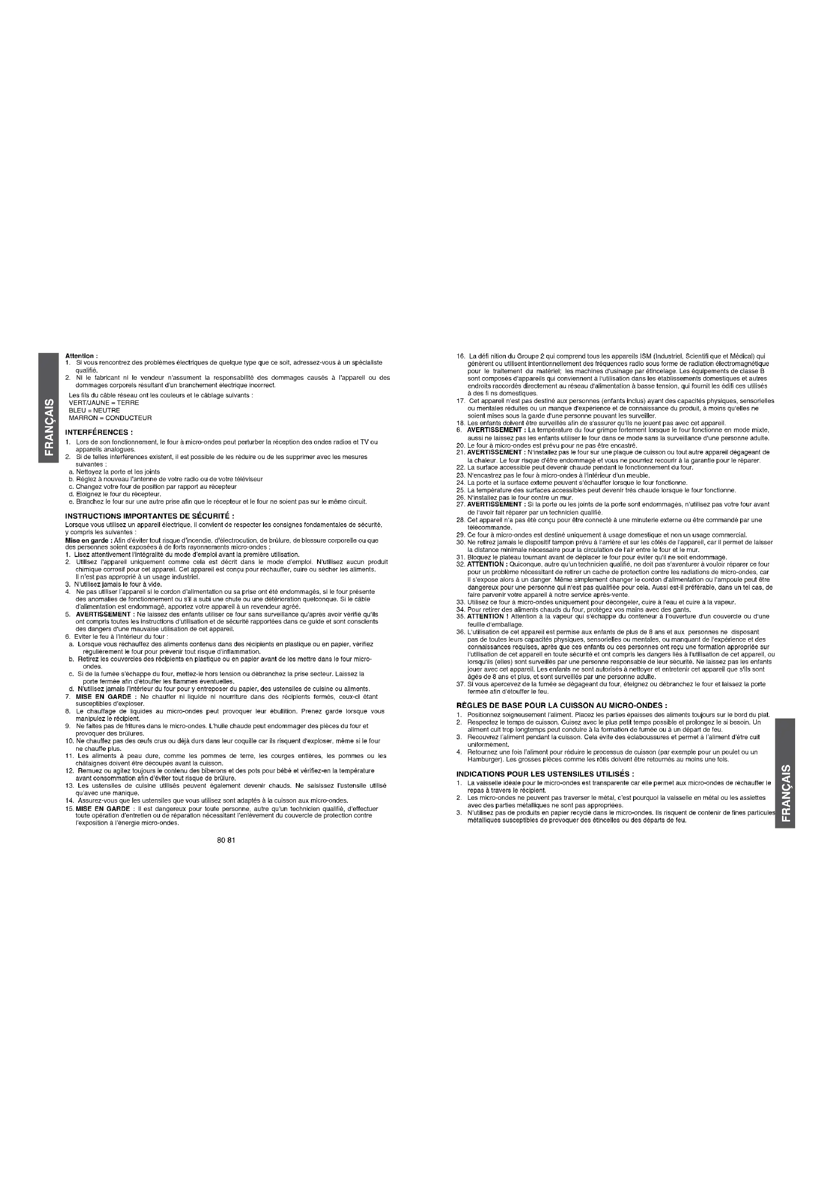 suivantes : a. Nettoyez la porte et les joints b. Réglez à nouveau l’antenne de votre radio ou de votre téléviseur c. Changez votre four de position par rapport au récepteur d. Eloignez le four du récepteur. e. Branchez le four sur une autre prise an que le récepteur et le four ne soient pas sur le même circuit. inSTrUcTionS iMPorTAnTeS De SécUriTé : Lorsque vous utilisez un appareil électrique, il convient de respecter les consignes fondamentales de sécurité, y compris les suivantes : An d’éviter tout risque d’incendie, d’électrocution, de brûlure, de blessure corporelle ou que des personnes soient exposées à de forts rayonnements micro-ondes :