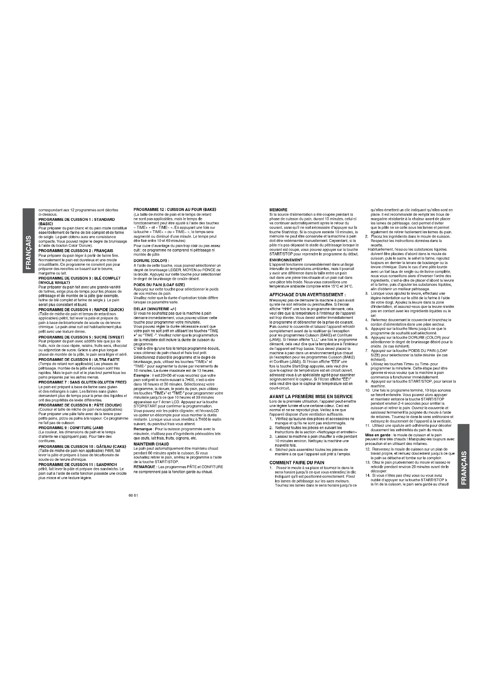 (WHOLE WHEAT) Pour préparer du pain fait avec une grande variété de farines, exige plus de temps pour les phases de pétrissage et de montée de la pâte (par exemple, farine de blé complet et farine de seigle.). Le pain serait plus consistant et lourd. PROGRAMME DE CUISSON 4 : RAPIDE (QUICK) (Taille de miche de pain et temps de retard non applicables) pétrit, fait lever la pâte et prépare du pain à base de bicarbonate de soude ou de levure chimique. Le pain ainsi cuit est habituellement plus petit avec une texture dense. PROGRAMME DE CUISSON 5 : SUCRÉ (SWEET) Pour préparer du pain avec additifs tels que jus de fruits, noix de coco râpée, raisins, fruits secs, chocolat ou adjonction de sucre. Grâce à une plus longue phase de montée de la pâte, le pain sera léger et aéré.