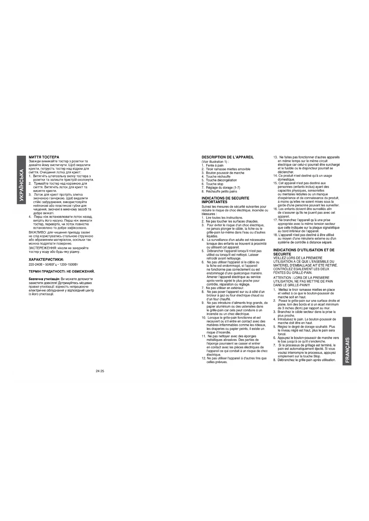 de le remettre en place. Assurez-vous que le tiroir est bien enclenché avant de mettre en marche le grille-pain. IMPORTANT : Pour nettoyer l‘extérieur du grille- pain, n‘utilisez jamais de paille de fer ou autres matières abrasives qui rayeraient la surface. ATTENTION : Pour des raisons de sécurité, ne plongez jamais l‘appareil dans l‘eau! FRANÇAIS INDICATION : Si vous prêtez l‘appareil, veuillez remettre également le mode d‘emploi. DONNEES TECHNIQUES : 220-240V • 50/60Hz • 1200-1500W Mise au rebut dans le respect de l‘environnement : Vous pouvez contribuer à protéger l‘environnement ! Il faut respecter les règlementations locales. La mise en rebut de votre appareil électrique usagé doit se faire dans un centre approprié de traitement des déchets. FRANÇAIS28 29 complete el ciclo de tostado, simplemente pulse el botón cancelar.