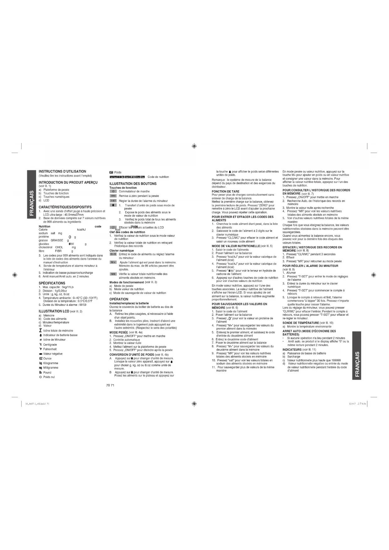 - Arrêt auto. se produit si le display afche “0” ou la même lecture pendant 2 minutes. INDICATEURS (voir Ill. 11) a) Puissance de basse de batterie b) Surcharge c) Valeur nutritionnelle plus haute que 199999 d) Valeur nutritionnelle négative ou entrée du mode de valeur nutritionnelle pendant l‘entrée du code d’aliment M_6407-1_v02.indd 71 12-9-7 上午8:5472 73 FRANÇAIS FRANÇAIS
