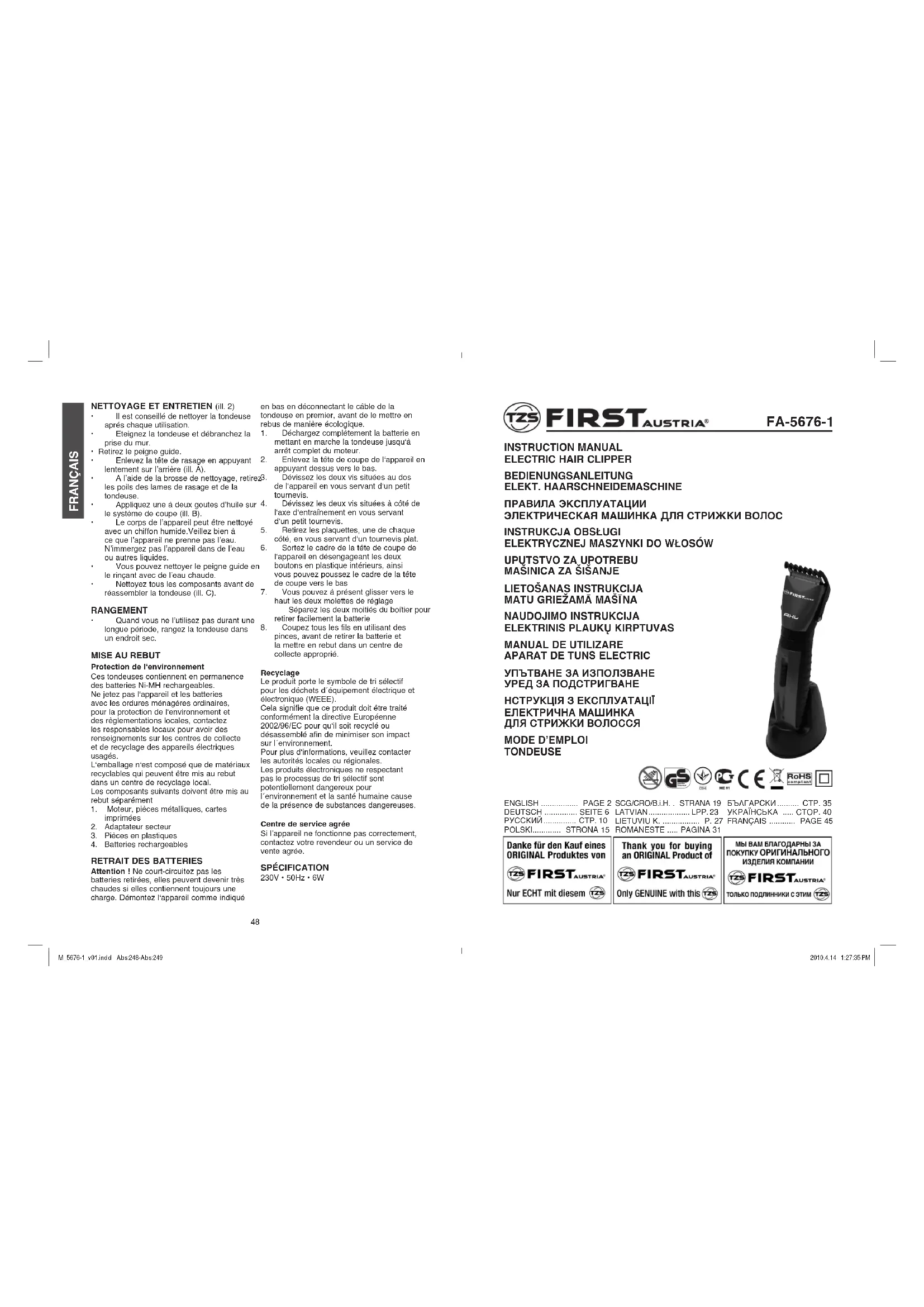 FA56761 - Tondeuse First Austria - Notice d'utilisation et mode d'emploi gratuit
