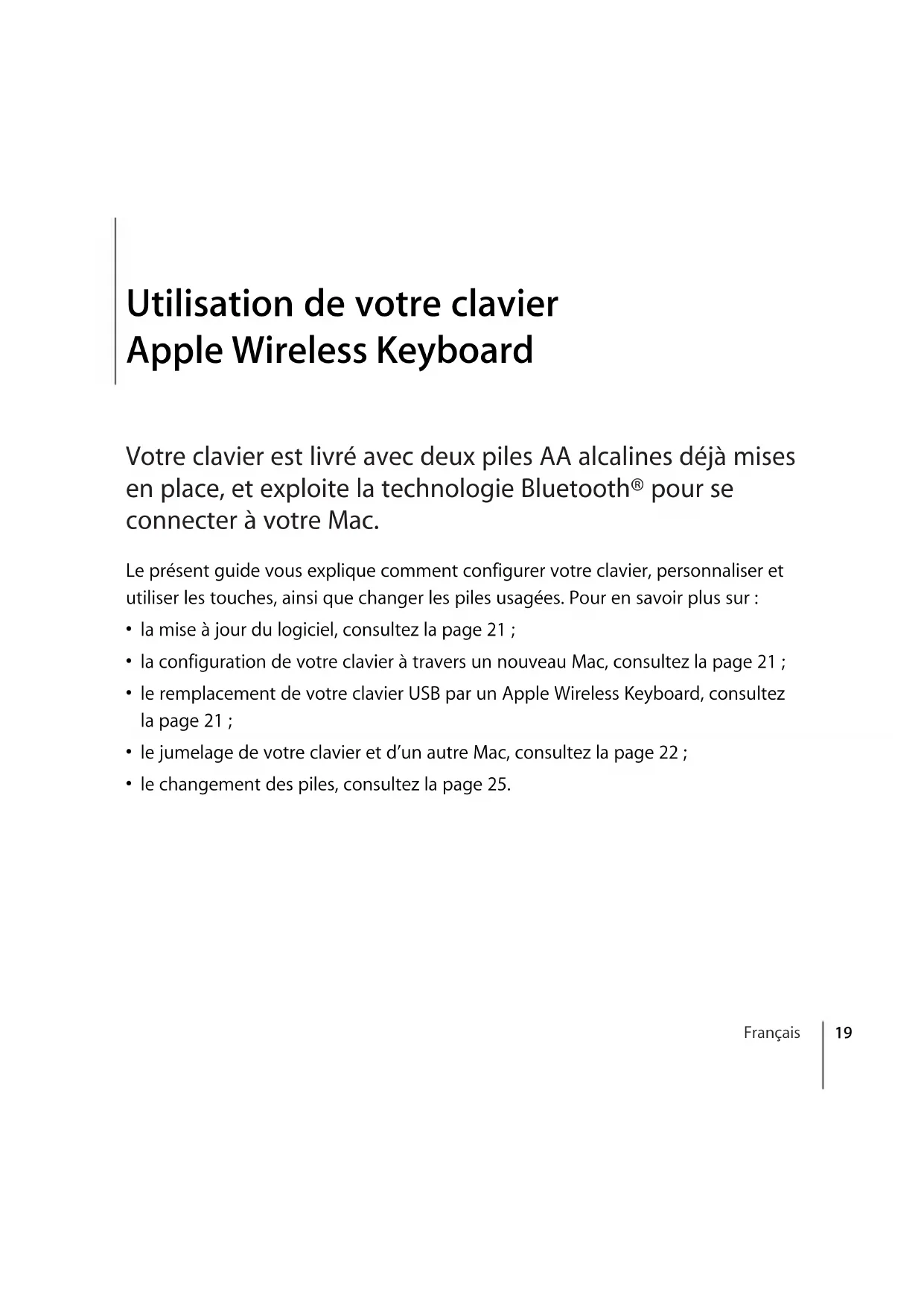 Utilisation de votre clavier Apple Wireless Keyboard Votre clavier est livré avec deux piles AA alcalines déjà mises en place, et exploite la technologie Bluetooth® pour se connecter à votre Mac. Le présent guide vous explique comment configurer votre clavier, personnaliser et utiliser les touches, ainsi que changer les piles usagées. Pour en savoir plus sur :