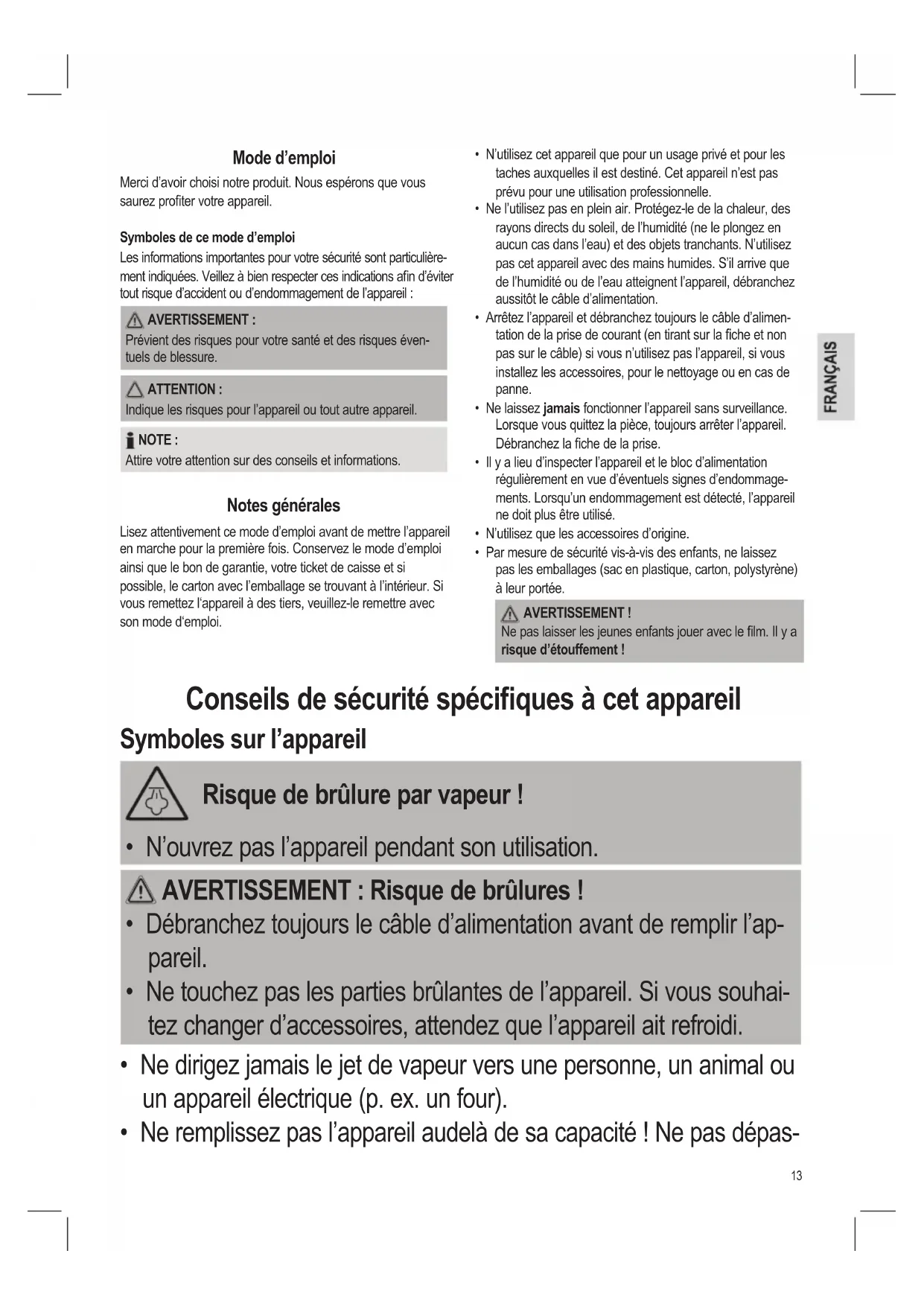 Prévient des risques pour votre santé et des risques éven- tuels de blessure. ATTENTION : Indique les risques pour l’appareil ou tout autre appareil. NOTE : Attire votre attention sur des conseils et informations. Notes générales Lisez attentivement ce mode d’emploi avant de mettre l’appareil en marche pour la première fois. Conservez le mode d’emploi ainsi que le bon de garantie, votre ticket de caisse et si possible, le carton avec l’emballage se trouvant à l’intérieur. Si vous remettez l‘appareil à des tiers, veuillez-le remettre avec son mode d‘emploi. Conseils de sécurité spéciques à cet appareil Symboles sur l’appareil Risque de brûlure par vapeur !
