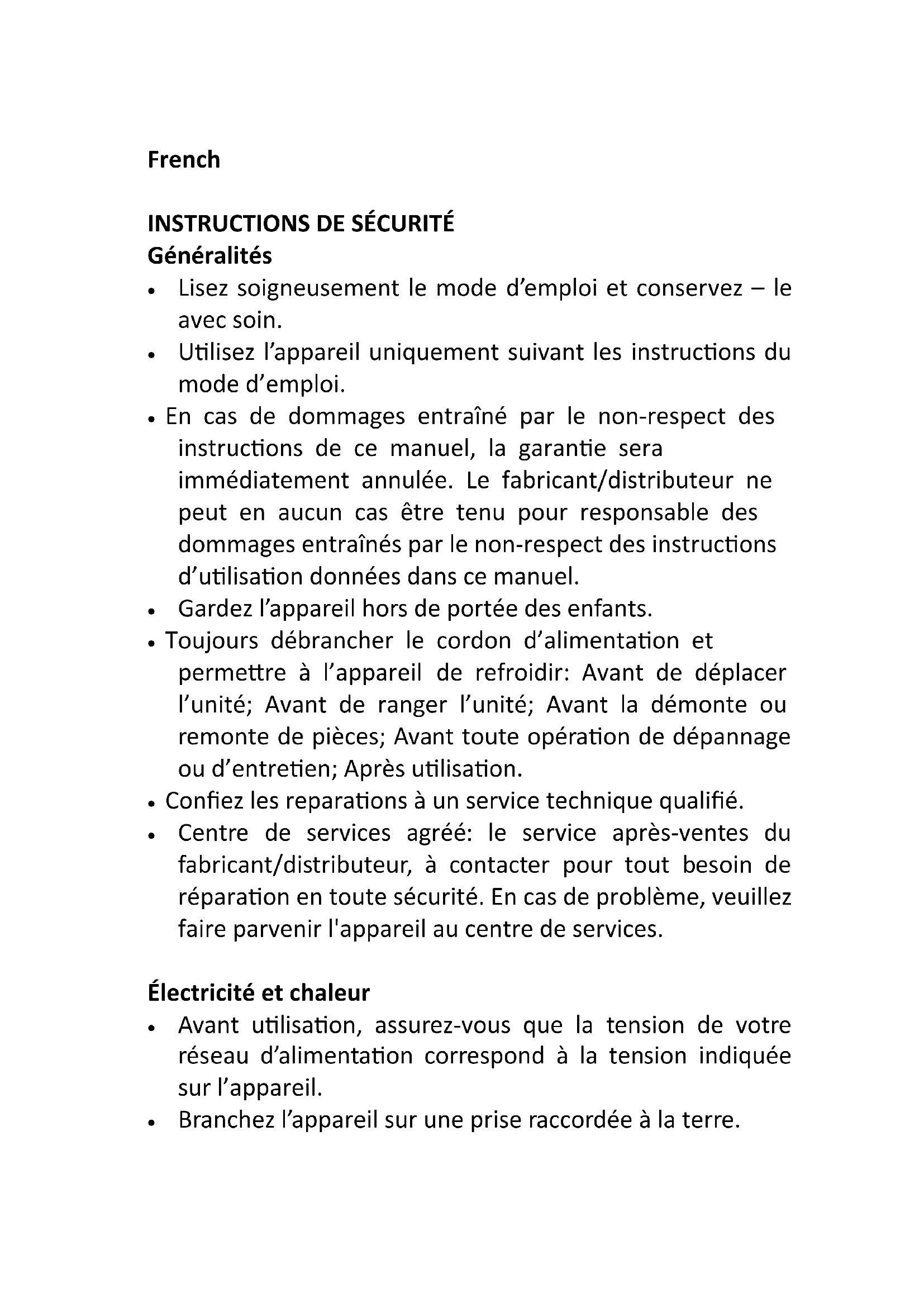 Utilisez l'appareil uniquement suivant les instructions du mode d'emploi. - En cas de dommages entrainé par le non-respect des instructions de ce manuel, la garantie sera immédiatement annulée. Le fabricant/distributeur ne peut enaucun cas être tenu pour responsable des dommages entrainés par le non-respect des instructions d'utilisation données dans ce manuel.