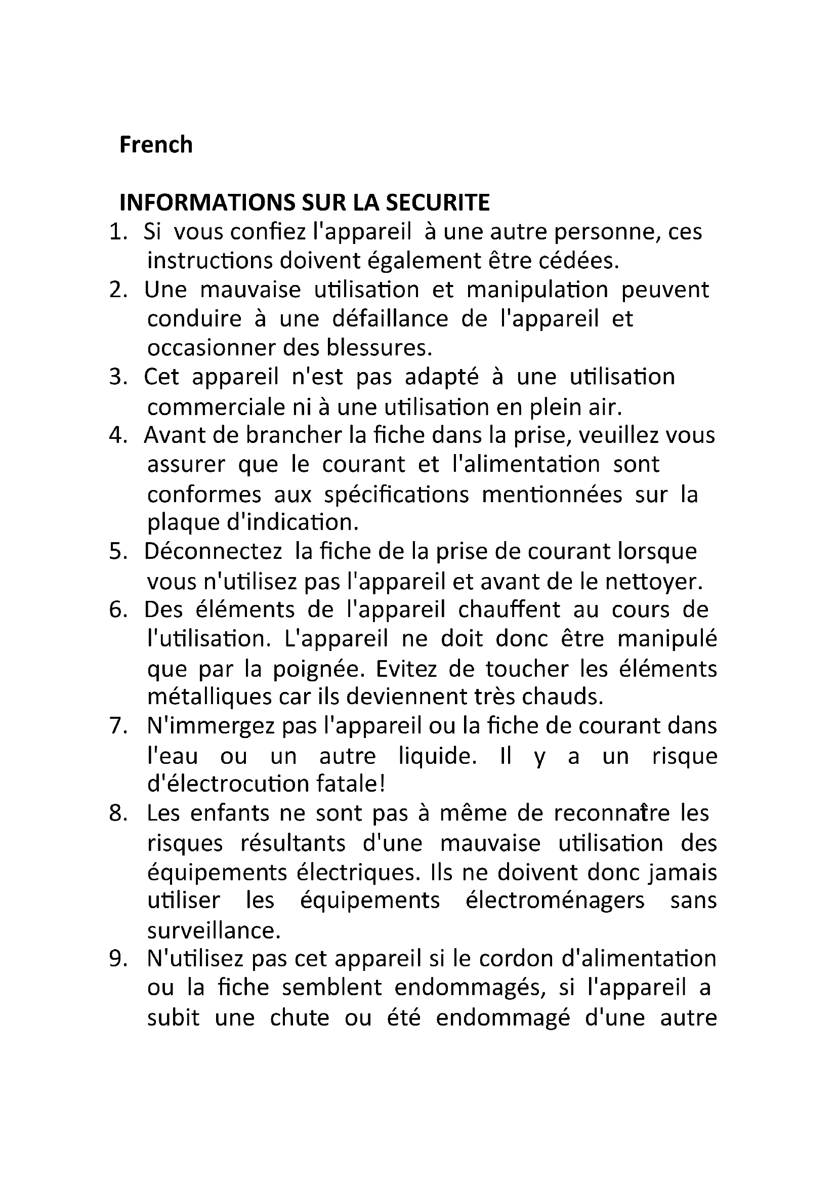 - Les enfants ne sont pas à même de reconnaître les risques résultants d'une mauvaise utilisation des équipements électriques. Ils ne doivent donc jamais utiliser les équipements électroménagers sans surveillance.