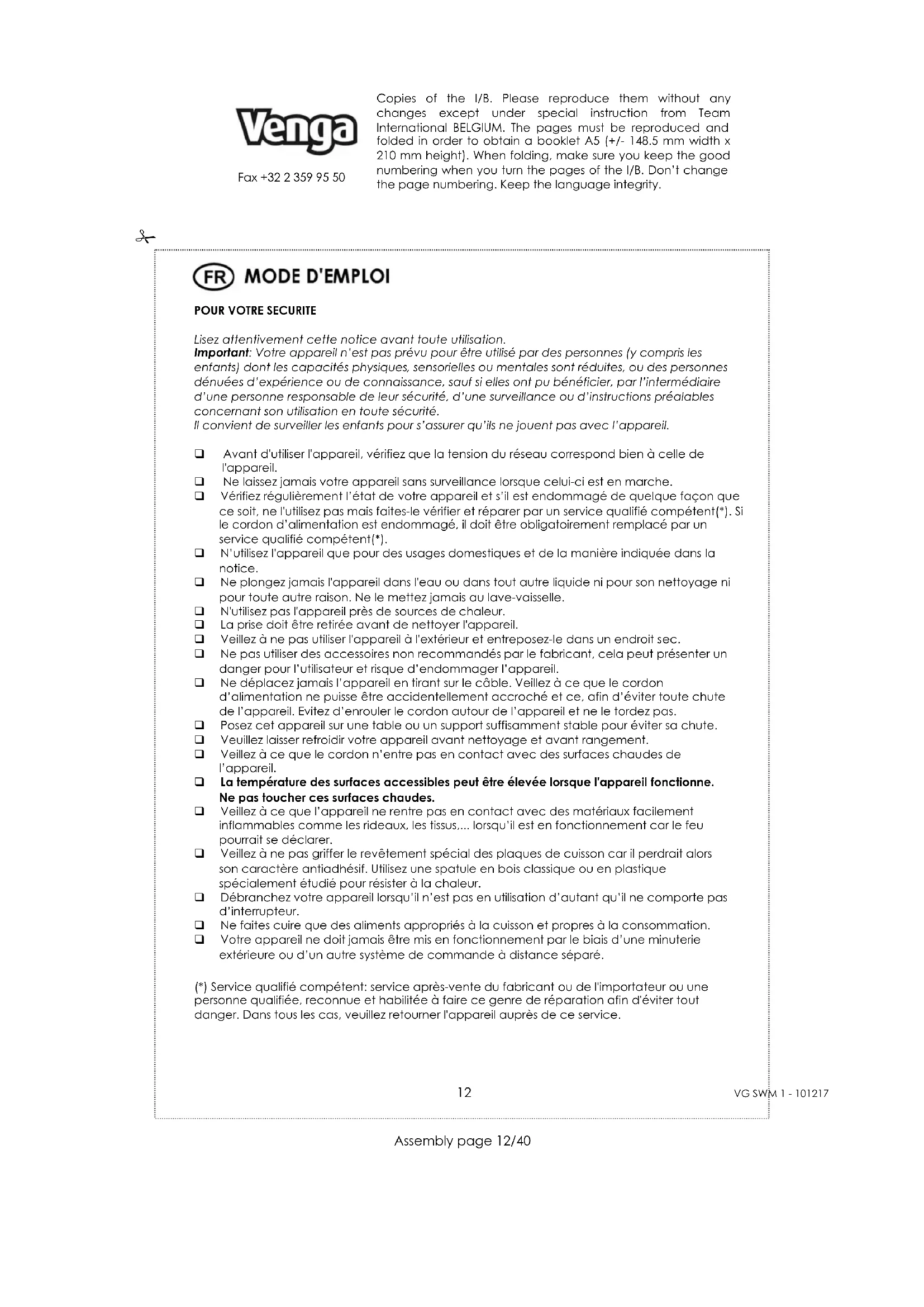Retrouvez gratuitement la notice de l'appareil VG SWM 1 Venga au format PDF.