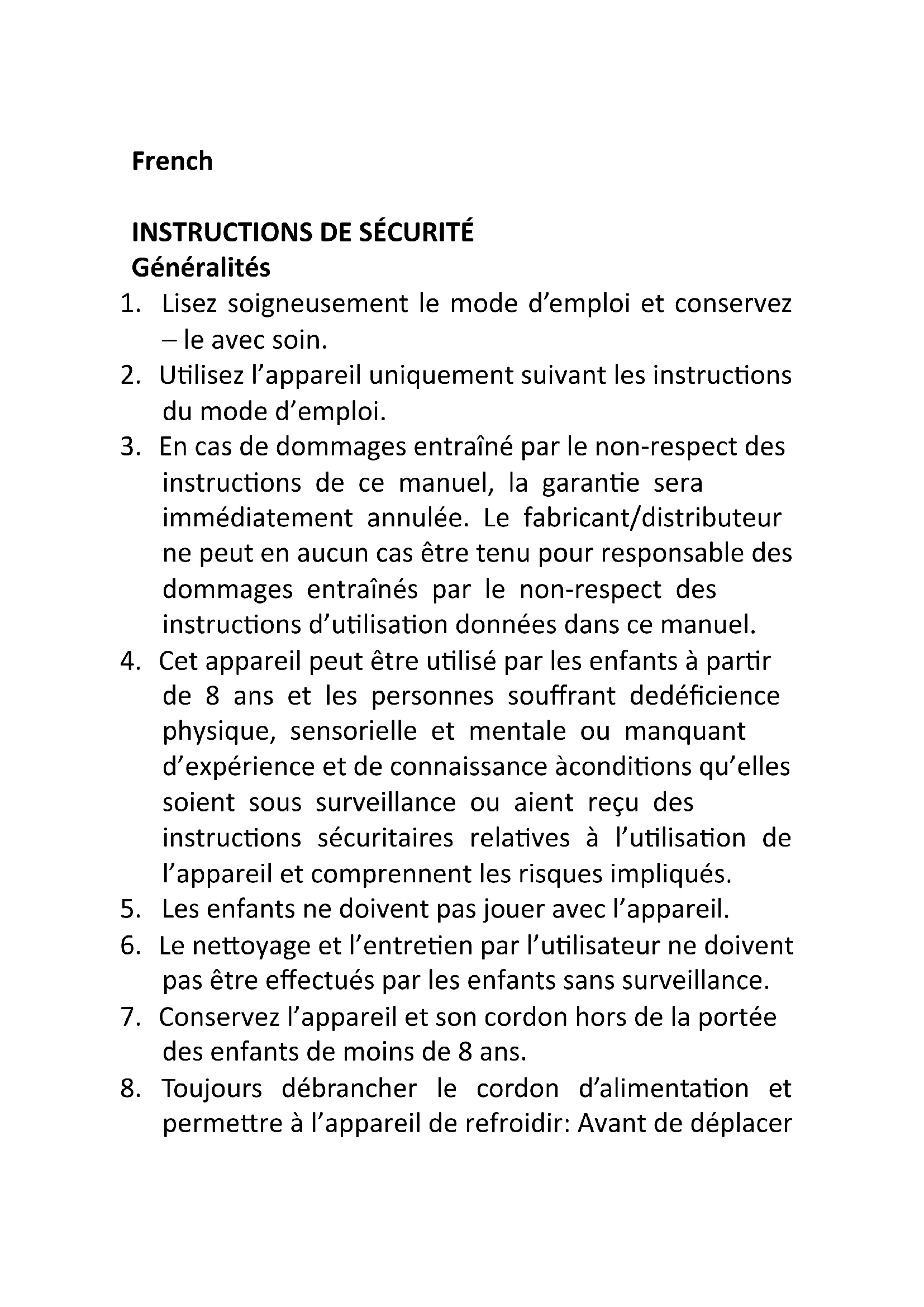 - Cet appareil peut être utilisé par les enfants à partir de 8 ans et les personnes souffrant de déficience physique, sensorielle et mentale ou manquant d’expérience et de connaissances, à condition qu’elles soient sous surveillance ou aient reçu des instructions sécuritaires relatives à l’utilisation de l’appareil et comprenant les risques impliqués.
