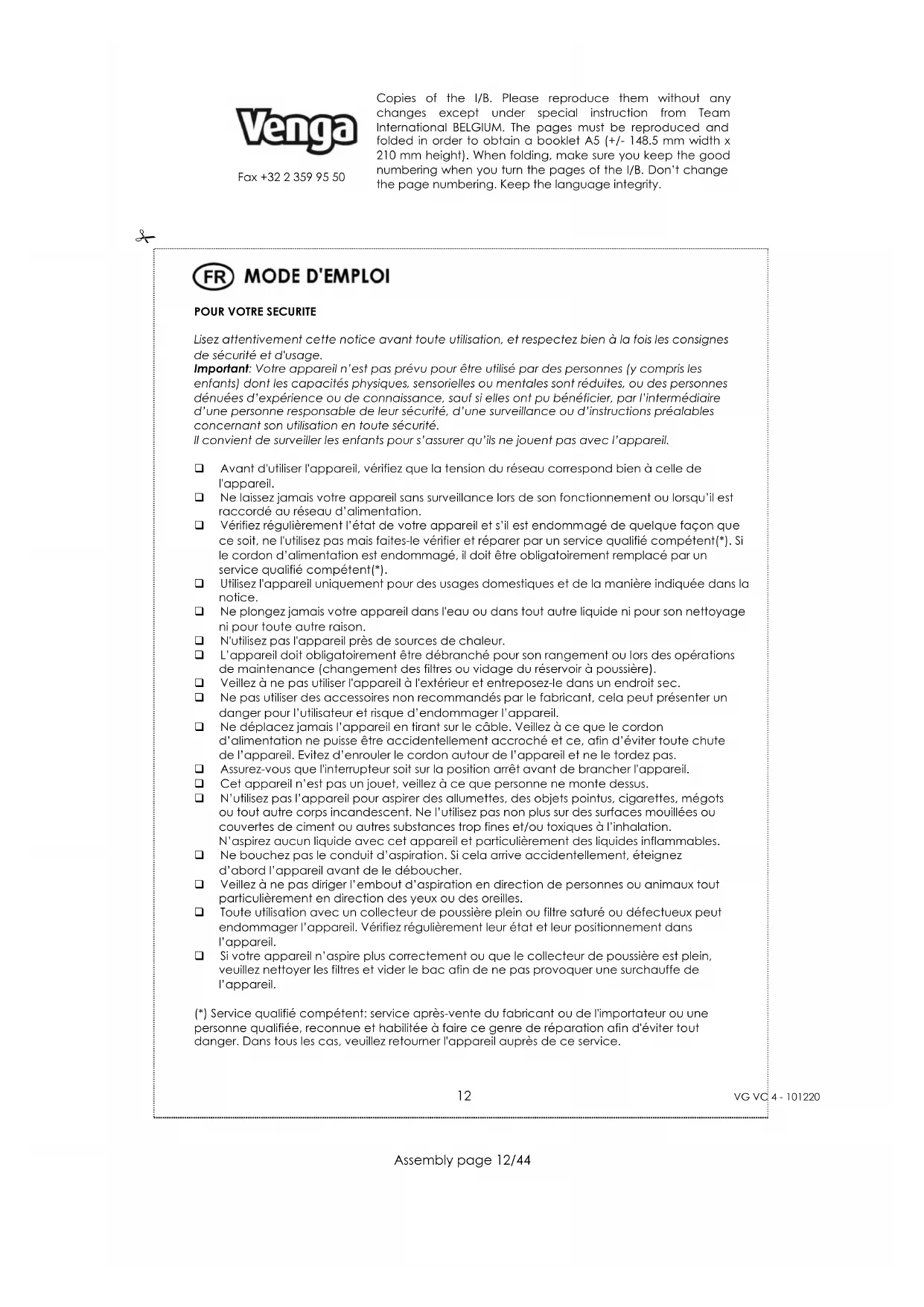 Afin de préserver notre environnement et notre santé, l’élimination en fin de vie des appareils électriques et électroniques doit se faire selon des règles bien précises et nécessite l’implication de chacun, qu’il soit fournisseur ou utilisateur. C’est pour cette raison que votre appareil, tel que le signale le symbole apposé sur sa plaque signalétique ou sur l'emballage, ne doit en aucun cas être jeté dans une poubelle publique ou privée destinée aux ordures ménagères. L'utilisateur a le droit de déposer l'appareil dans des lieux publics de collecte procédant à un tri sélectif des déchets pour être soit recyclé, soit réutilisé pour d’autres applications conformément à la directive. 15 VG VC 4 - 101220