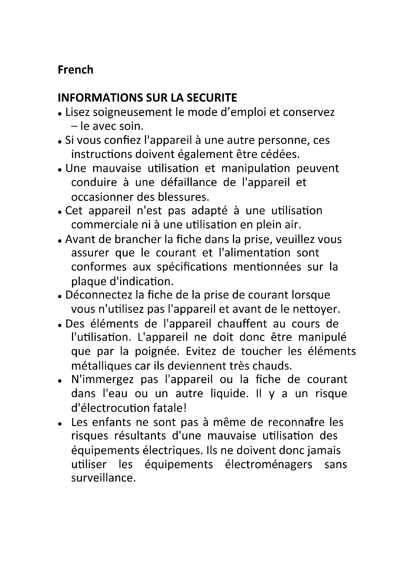 Les enfants ne sont pas à même de reconnaître les risques résultats d'une mauvaise utilisation des équipements ELECTriques. Ils ne doivent donc jamais utiliser les équipements electroménagers sans surveillance.
