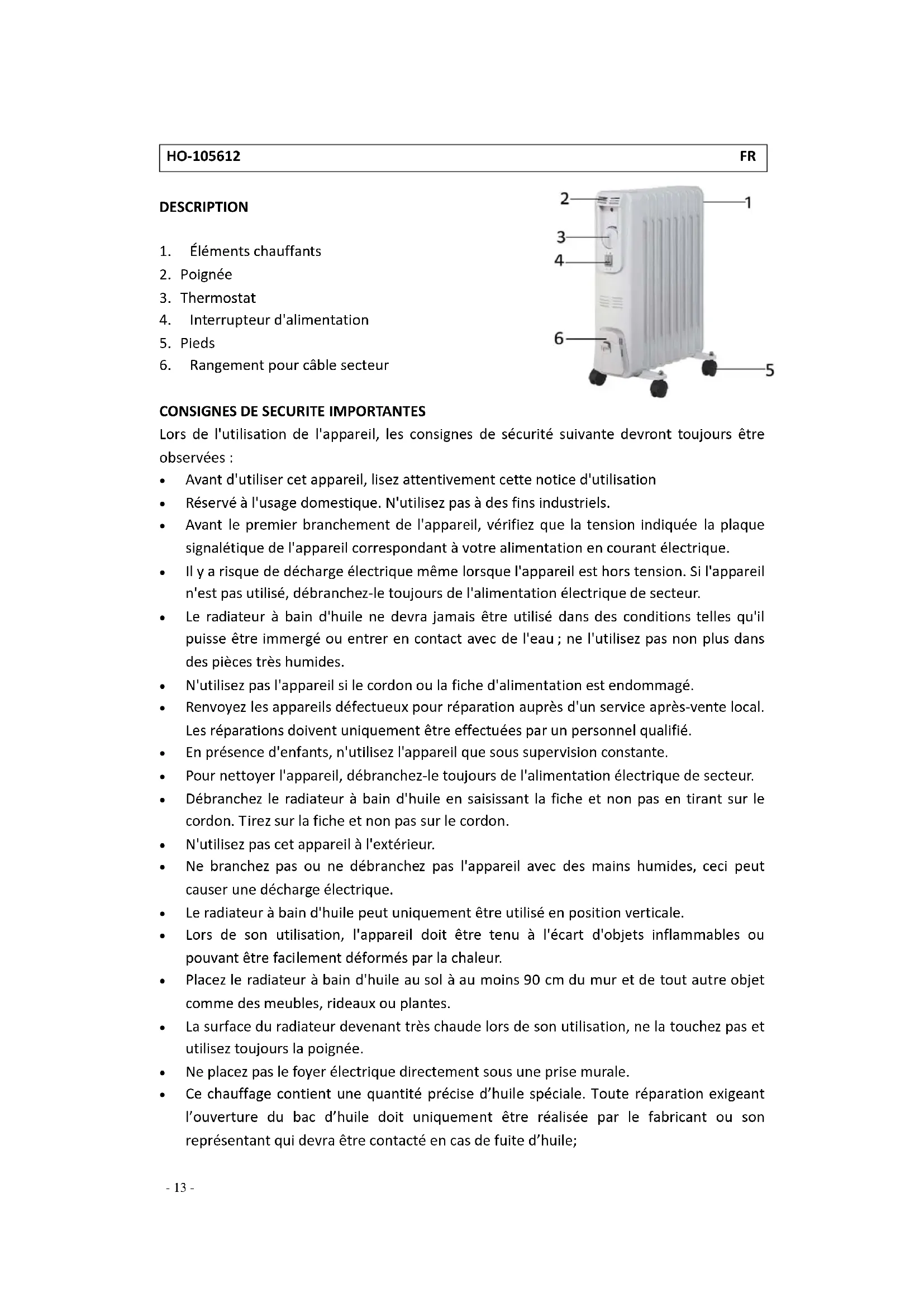 Ce chauffage contient une quantité précise d'huile spéciale. Toute réparation exigeant l'ouverture du bac d'huile doit uniquement être réalisée par le fabricant ou son représentant qui devra être contacté en cas de fuite d'huile;