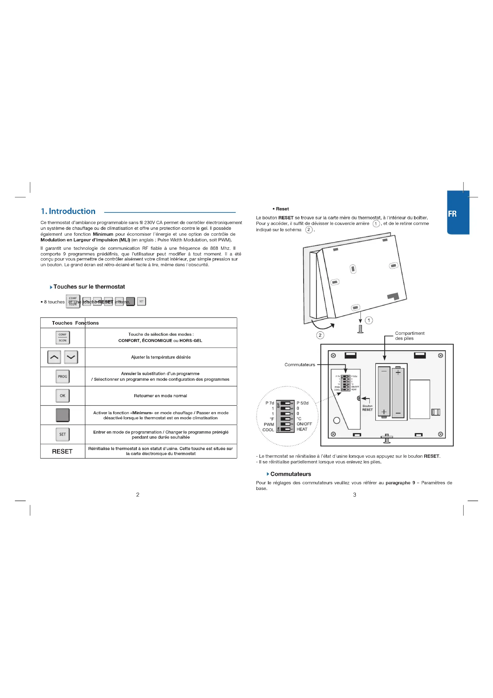 CommutateursCompartiment des piles - Le thermostat se réinitialise à l’état d’usine lorsque vous appuyez sur le bouton RESET. - Il se réinitialise partiellement lorsque vous enlevez les piles. Commutateurs Pour le réglages des commutateurs veuillez vous référer au paragraphe 9 – Paramètres de base.4