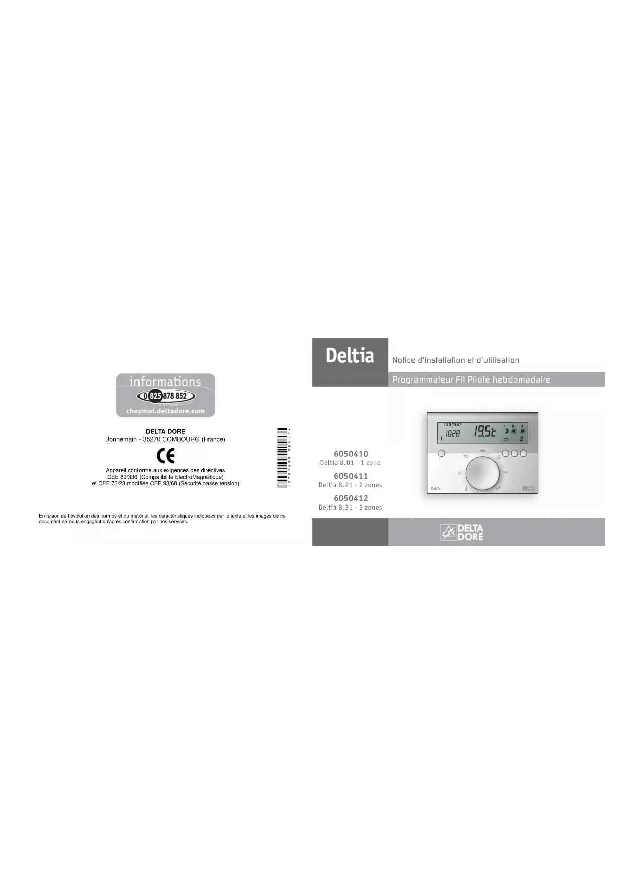 Deltia 8.31 - 3 zones Appareil conforme aux exigences des directives CEE 89/336 (Compatibilité ElectroMagnétique) et CEE 73/23 modifiée CEE 93/68 (Sécurité basse tension) DELTA DORE Bonnemain - 35270 COMBOURG (France) En raison de l'évolution des normes et du matériel, les caractéristiques indiquées par le texte et les images de ce document ne nous engagent qu'après confirmation par nos services. *2701638_Rev.1*- 2-