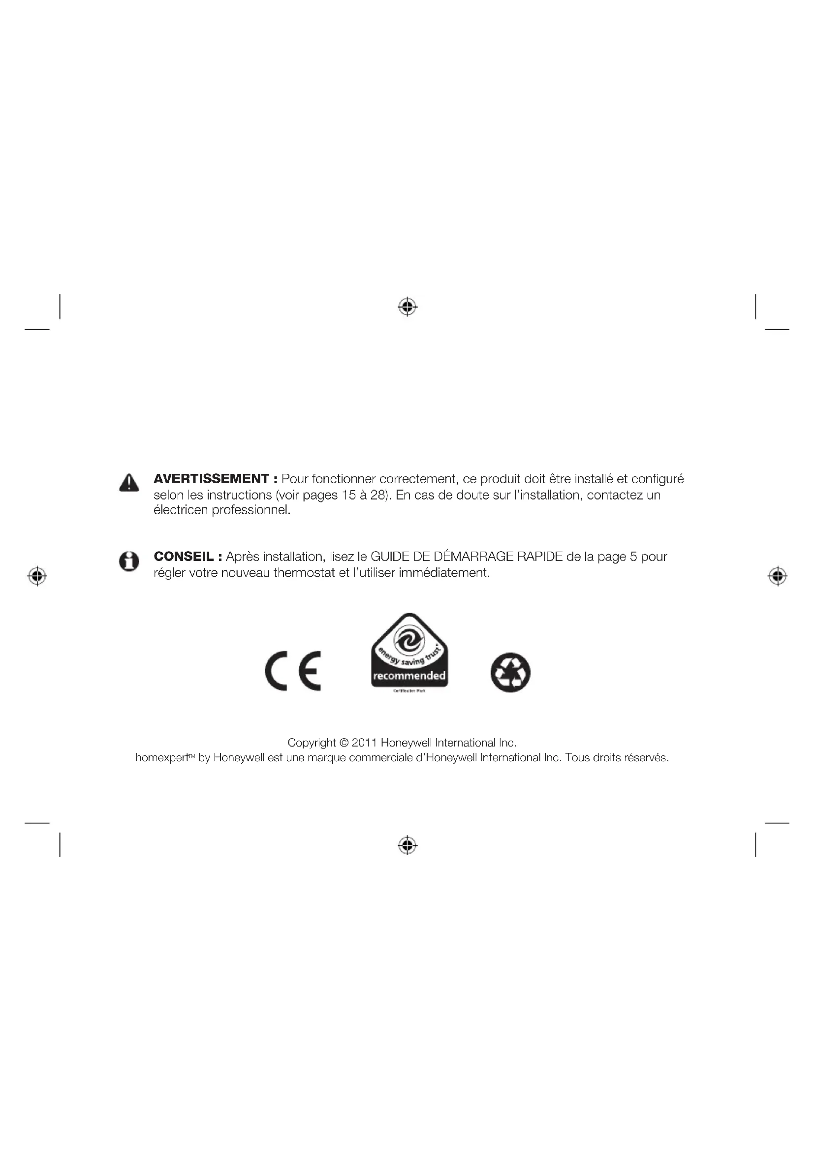 Garantie limitée Honeywell garantit ce produit pour une période de trois ans après sa date d’achat. Nous nous engageons à remplacer ou à réparer, à notre discrétion, les produits qui seraient devenus défectueux au cours de ces trois premières années, uniquement à la suite d’un vice de matériau ou de fabrication. Si le produit n’a pas été installé ou entretenu conformément aux instructions d’Honeywell, s’il n’a pas été utilisé correctement, ou si on a tenté de le rectifier, de le démonter ou de le modifier en quelque façon que ce soit, cette garantie sera rendue nulle et non avenue. Cette garantie constitue l’entièreté de la responsabilité d’Honeywell. Elle ne couvre pas les pertes ou dégâts découlant d’un produit défectueux, ni ses coûts d’installation. Si le produit est défectueux, veuillez le retourner à l’endroit d’achat, accompagné d’une preuve d’achat ou d’un reçu. Ceci n’affecte pas vos droits de garantie légale. Pour une liste compléte des conditions, rendez-vous sur www.homexpertbyhonyewell.com. Veuillez conserver ces instructions pour une consultation future. © 2011 Honeywell International Inc.homexpert