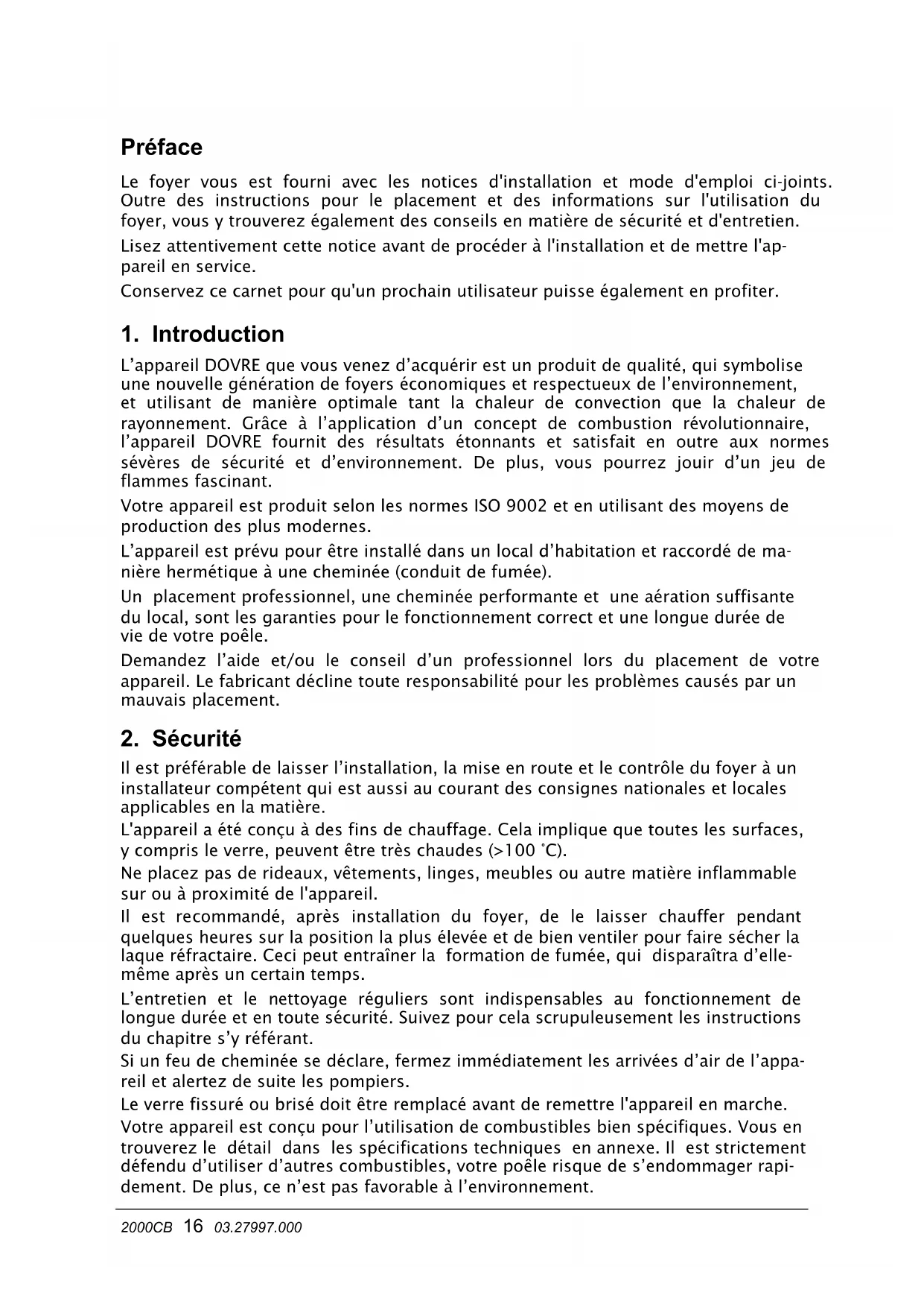 L'appareil DOVRE que vous venez d'acquérir est un produit de qualité, qui symbolise une nouvelle génération de foyers économiques et respectueux de l'environnement, et utilisant de manière optimale tant la chaleur de convection que la chaleur de rayonnement. Grâce à l'application d'un concept de combustion révolutionnaire, l'appareil DOVRE fournit des résultats étonnants et satisfait en outre aux normes sévères de sécurité et d'environnement. De plus, vous pourrez jouir d'un jeu de flammes fascinant.