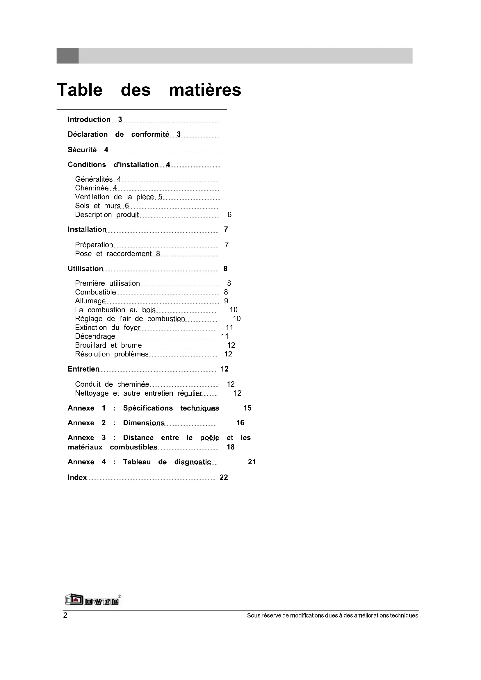 Ce mode d'emploi contient des informations concernant l'installation, l'utilisation et l'entretien en toute sécurité de l'appareil de chauffage DOVRE. Si vous souhaitez receivevoir des informations complémentaires ou des specifications techniques ou si vous rencontres un problème lors de l'installation, veuillez d'abord contacter votre distributeur.