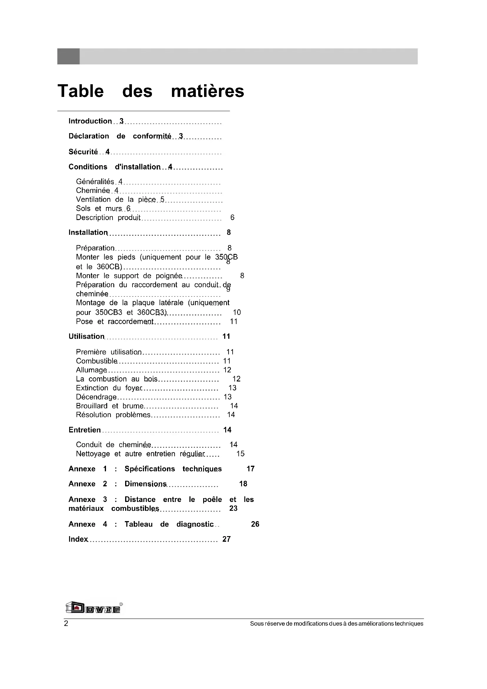 Ce mode d'emploi contient des informations concernant l'installation, l'utilisation et l'entretien en toute sécurité de l'appareil de chauffage DOVRE. Si vous souhaitez receivevoir des informations complémentaires ou des specifications techniques ou si vous rencontres un problème lors de l'installation, veuillez d'abord contacter votre distributeur.