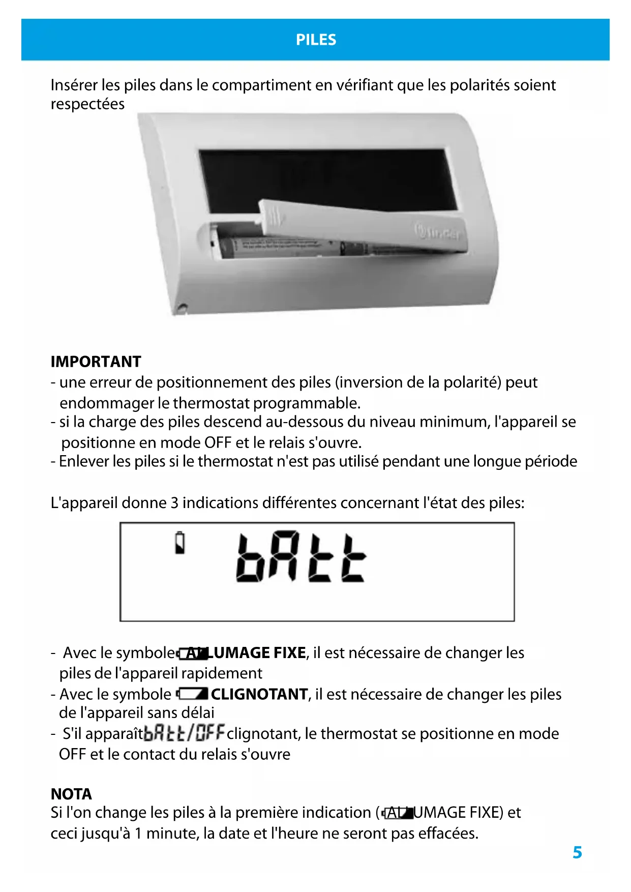 Si l'on change les piles à la première indication (ALUMAGE FIXE) et ceci jusqu'à 1 minute, la date et l'heure ne seront pas effacées.