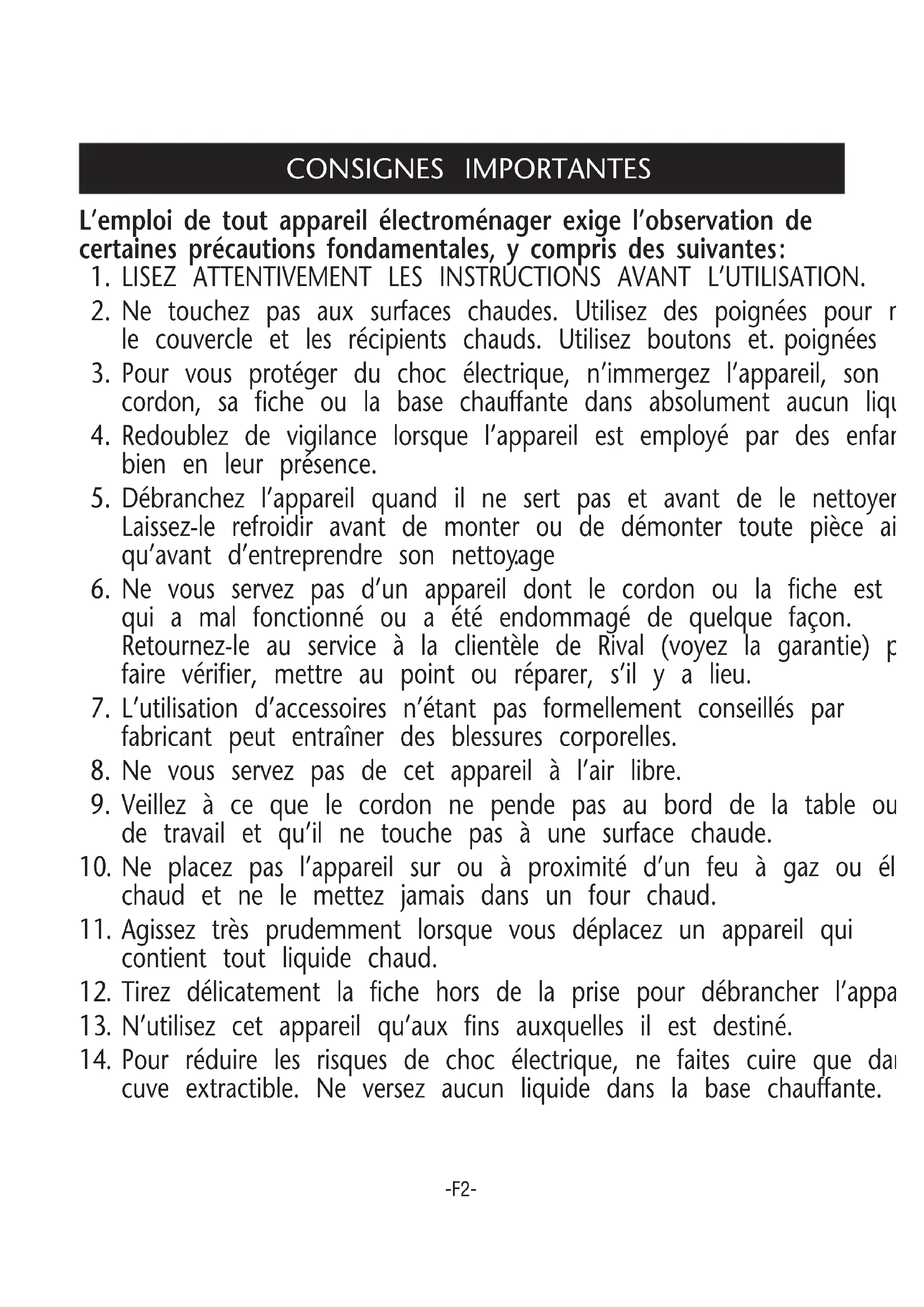 Pour réduire les risques de choc électrique, ne faites cuire que dans la cuve extractible. Ne versez aucun liquide dans la base chauffante.CONSERVEZ CES INSTRUCTIONS Cet appareil n’est destiné qu’à l’USAGE DOMESTIQUE. Il ne contient pas de pièces réparables. Son bloc d’alimentation ne requiert jamais de graissage. Ne tentez en aucun cas de réparer l’appareil. Cet appareil est pourvu d’un cordon électrique court qui ne devrait ni s’emmêler ni faire trébucher, comme pourrait le faire un cordon plus long. L’emploi d’un cordon prolongateur est permis à condition que sa tension assignée soit au moins égale à celle du CUIT-RIZ. Ce cordon ne doit pas pendre du plan de travail ou du plateau de table, pour éviter que les enfants ne puissent le tirer ou qu’il risque de faire trébucher accidentellement. N’immergez la base chauffante dans absolument aucun liquide. Nous n’assumons aucune responsabilité en ce qui concerne les dommages qui découlent de la non-observation des instructions et d’une utilisation ou d’une manipulation incorrectes. -F3- Nous vous félicitons d’être devenu l’heureux propriétaire d’un nouveau CUIT- RIZ, un appareil commode et extrêmement polyvalent. Il cuit non seulement le riz à la perfection à tout coup, mais permet aussi de préparer des soupes et des ragoûts succulents, de cuire les légumes à la vapeur et même de cuire des gâteaux! Visitez www.rivalproducts.com, le site Web de Rival, pour obtenir de plus amples renseignements sur le CUIT-RIZ et ses nombreuses utilisations!