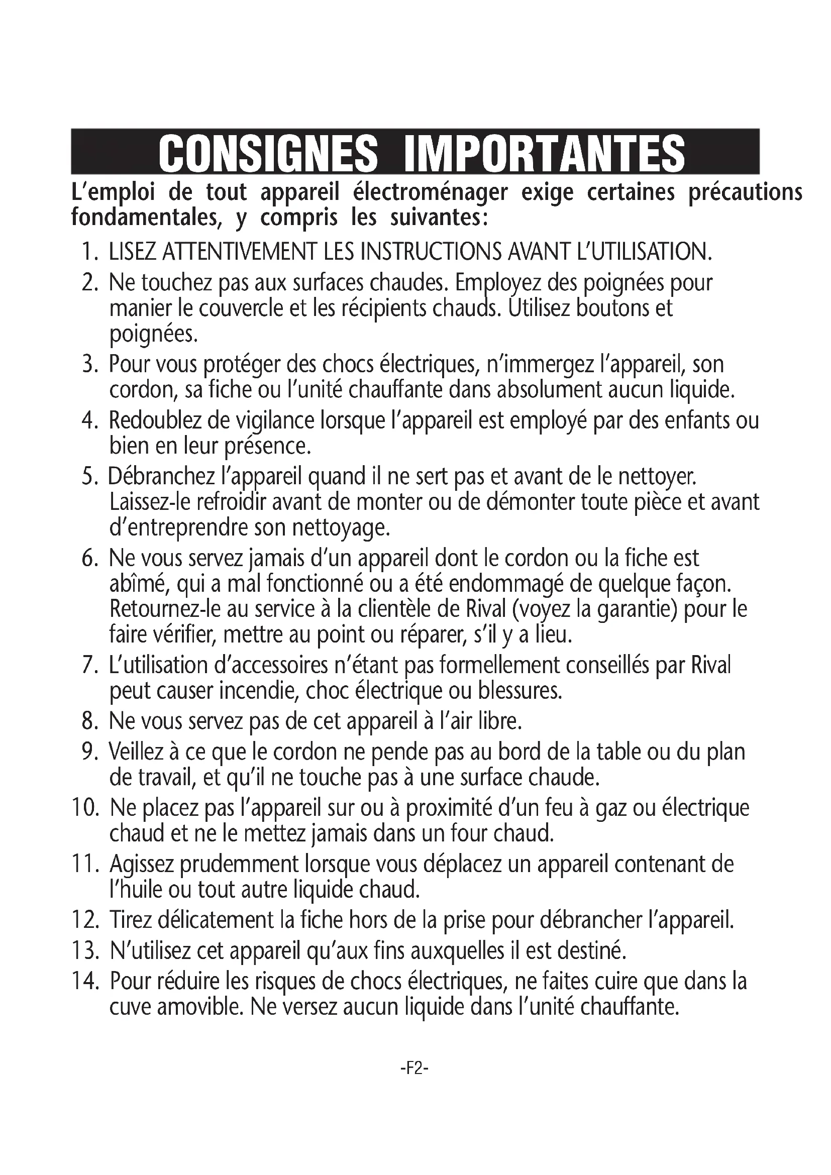 cuve amovible. Ne versez aucun liquide dans l’unité chauffante.CONSERVEZ CES INSTRUCTIONS Cet appareil n’est destiné qu’à l’USAGE DOMESTIQUE. Il ne contient pas de pièces que puisse réparer l’utilisateur. L’unité de puissance n’a jamais besoin d’être lubrifiée. Ne tentez en aucune circonstance de le réparer. De plus, l’appareil est pourvu d’un cordon électrique court qui ne devrait ni s’emmêler ni faire trébucher, comme risquerait de le faire un cordon plus long. L’emploi d’une rallonge est permis à condition que sa tension assignée soit au moins égale à celle du CUIT-RIZ. La rallonge ne doit pas pendre du plan de travail ou du plateau de table, pour éviter que les enfants ne puissent la tirer ou qu’elle risque de faire trébucher accidentellement. N’immergez l’unité chauffante dans absolument aucun liquide. Nous n’assumons aucune responsabilité en ce qui concerne les dommages qui découlent de la non-observation des instructions et d’une utilisation ou bien d’une manipulation incorrectes. -F3- Nous vous félicitons d’être devenu l’heureux propriétaire d’un nouveau CUIT- RIZ, un appareil extrêmement polyvalent. Il cuit non seulement le riz à la perfection à tout coup, mais permet aussi de préparer des soupes et des ragoûts succulents, de cuire les légumes à la vapeur et même de cuire les gâteaux! Visitez le site Web de Rival à www.rivalproducts.com pour obtenir de plus amples renseignements sur le CUIT-RIZ et ses nombreuses utilisations!