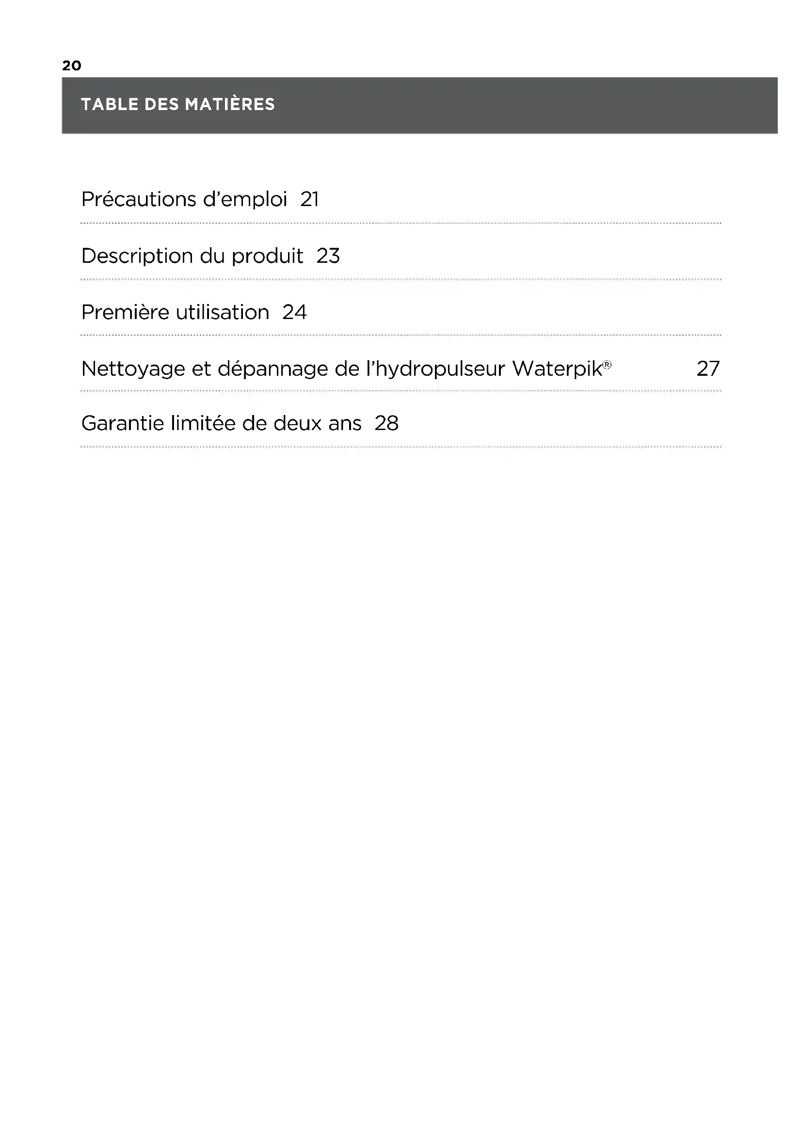 Water Pik, Inc. garantit à l'acquéreur/au propriétaire initial de ce produit que ce dernier est exempt de tout vice de matériau ou de fabrication pendant une période de deux ans à compter de la date d'achat. Conservez votre reçu comme preuve de la date d'achat. Water Pik, Inc. se réserve le droit de demander à ce que le produit lui soit renvoyé pour analyse afin de confirmer que la demande est couverte par la garantie. Water Pik, Inc. procédera au remplacement de toute partie de ce produit qu'elle jugera défectueuse, à condition que le produit n'ait pas fait l'objet d'usage impropre ou abusif, qu'il n'ait subi aucune modification ni aucun dommage après son achat et qu'il ait été utilisé conformément aux présentes instructions. Tout service de réparation ou de remplacement fourni dans le cadre de la garantie sera effectué par le distributeur local, dont vous trouverez les détails sur [www.waterpik.com/intl]. Sur demande du client, un exemplaire de la garantie ainsi que les renseignements concernant le distributeur local seront fournis par courrier électronique ou postal. Cette garantie limitée ne couvre pas les accessoires tels les embouts, les têtes de brosse, etc.