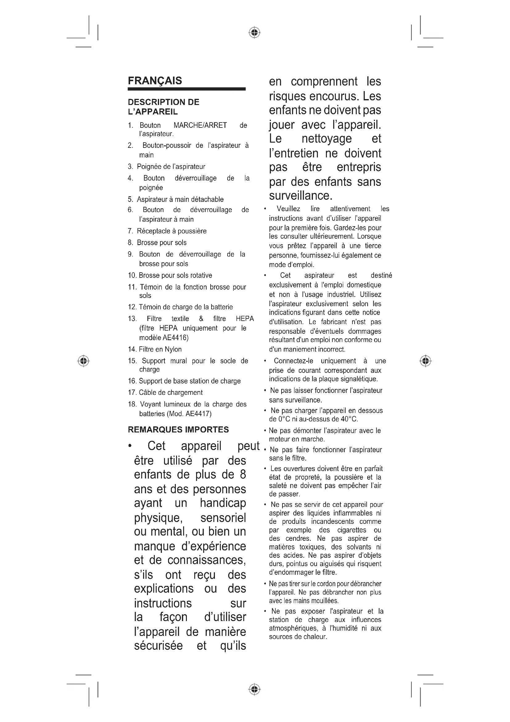 - Cet appareil peut être utilisé par des enfants de plus de 8 ans et des personnes ayant un handicap physique, sensoriel ou mental, ou bien un manque d’expérience et de connaissances, s’ils ont reçu des explications ou des instructions sur la façon d’utiliser l’appareil de manière sécurisée et qu’ils en comprennent les risques encourus. Les enfants ne doivent pas jouer avec l’appareil. Le nettoyage et l’entretien ne doivent pas être entrepris par des enfants sans surveillance.