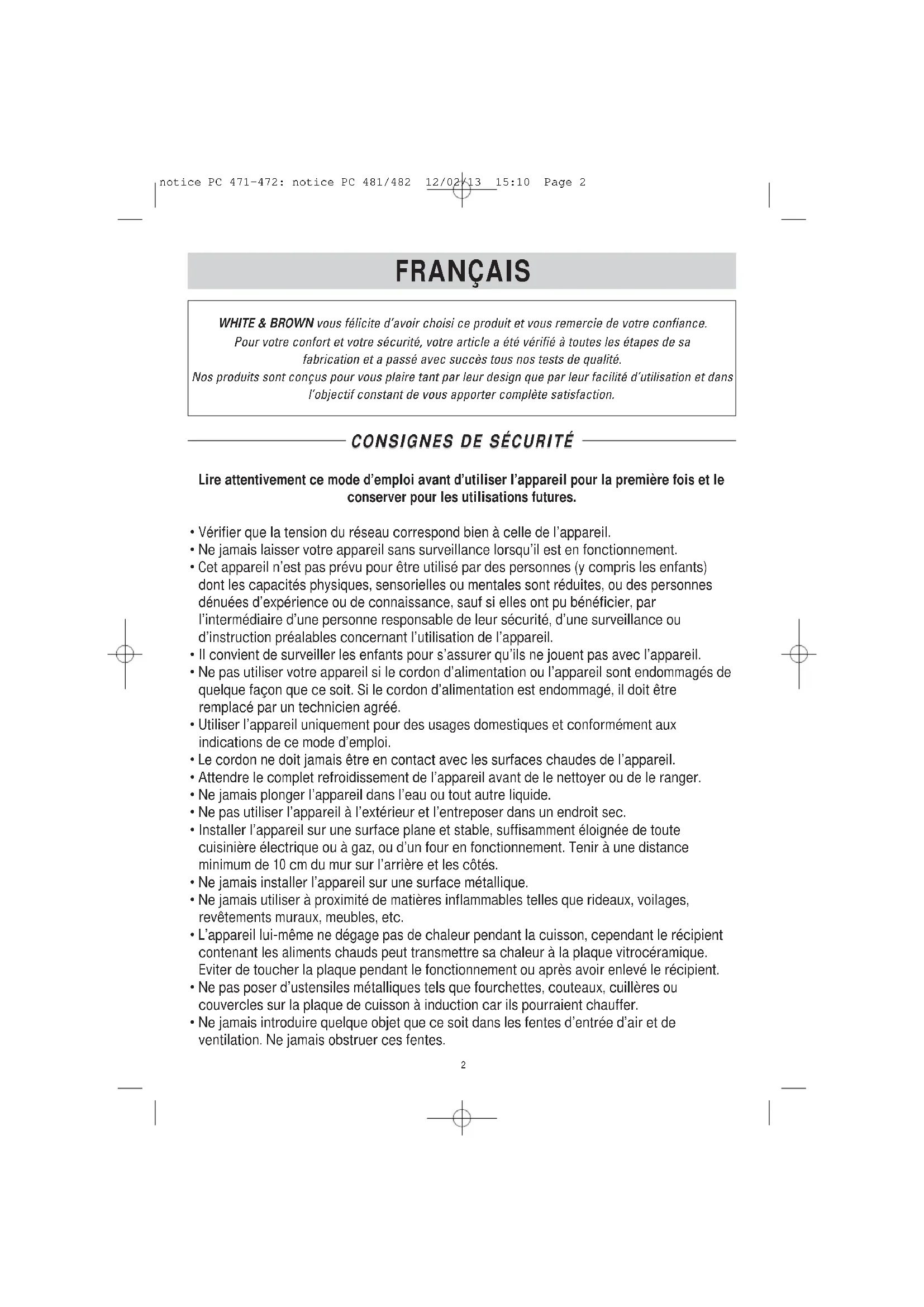 WHITE & BROWN vous félicite d'avoir choisi ce produit et vous remercie de votre confiance.