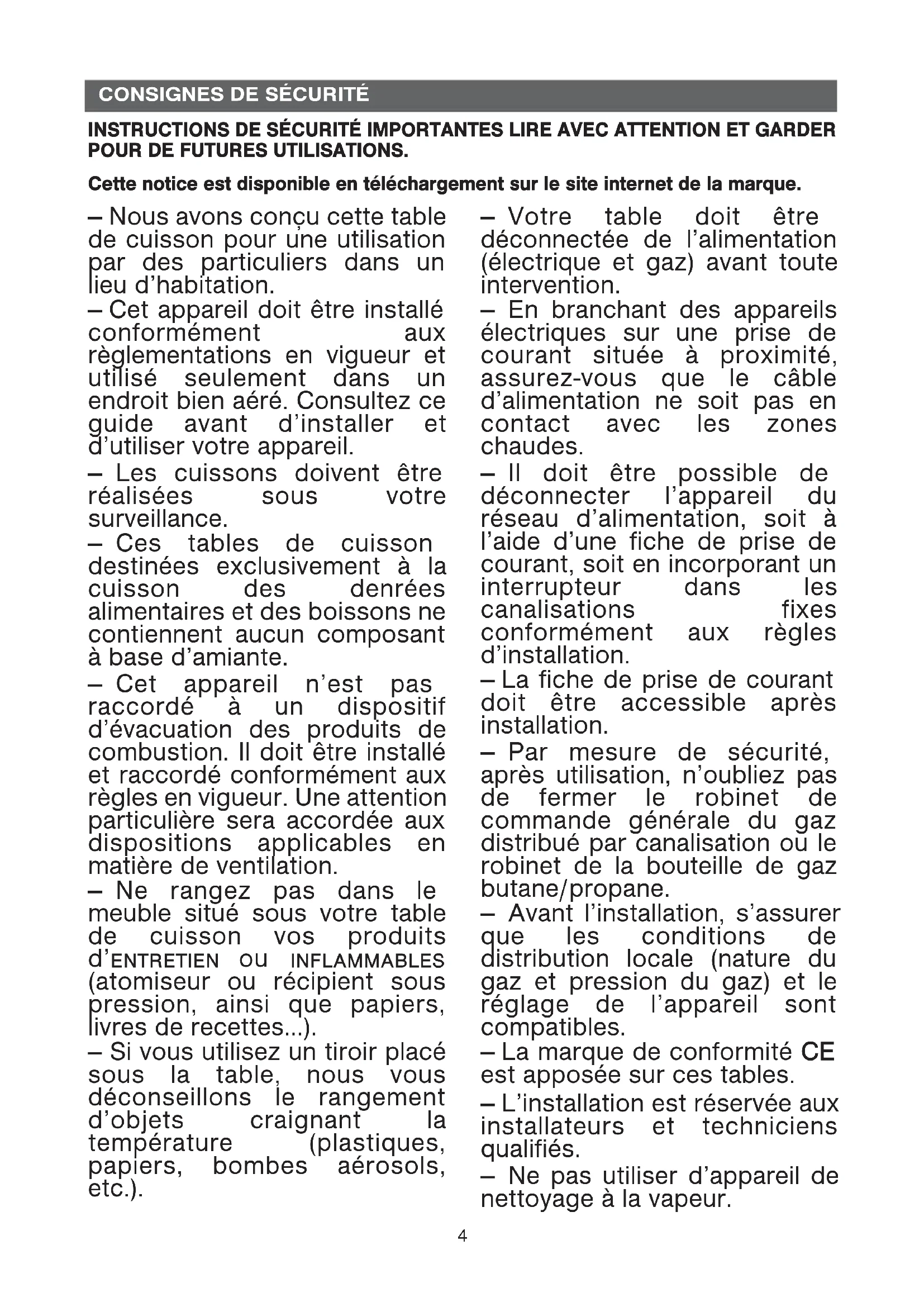 — Nous avons conçu cette table de cuisson pour une utilisation par des particuliers dans un lieu d’habitation. — Cet appareil doit être installé conformément aux règlementations en vigueur et utilisé seulement dans un endroit bien aéré. Consultez ce guide avant d’installer et d’utiliser votre appareil. — Les cuissons doivent être réalisées sous votre surveillance. — Ces tables de cuisson destinées exclusivement à la cuisson des denrées alimentaires et des boissons ne contiennent aucun composant à base d’amiante. — Cet appareil n’est pas raccordé à un dispositif d’évacuation des produits de combustion. Il doit être installé et raccordé conformément aux règles en vigueur. Une attention particulière sera accordée aux dispositions applicables en matière de ventilation. — Ne rangez pas dans le meuble situé sous votre table de cuisson vos produits