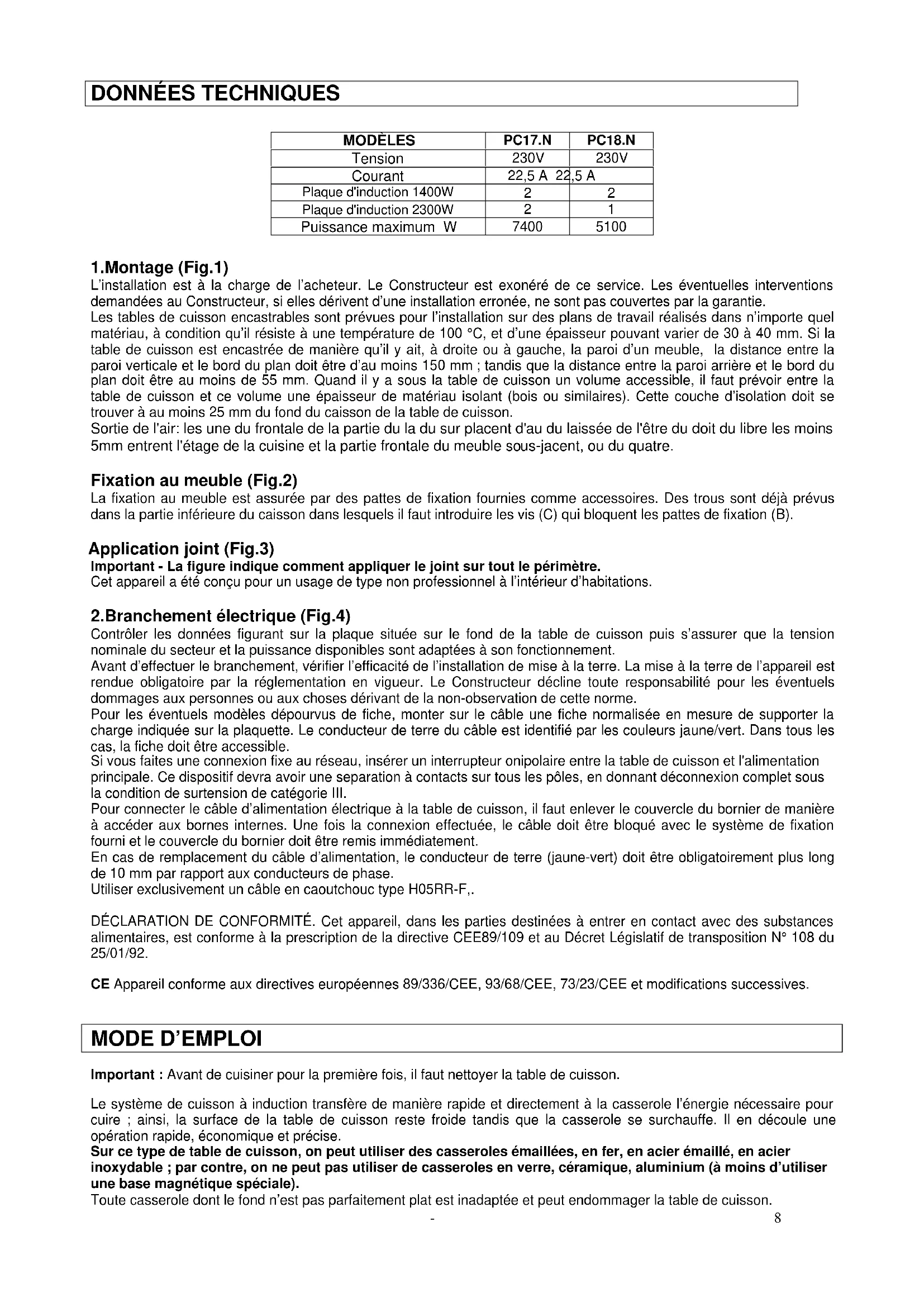 Important : Avant de cuisiner pour la première fois, il faut nettoyer la table de cuisson. Le système de cuisson à induction transfère de manière rapide et directement à la casserole l’énergie nécessaire pour cuire ; ainsi, la surface de la table de cuisson reste froide tandis que la casserole se surchauffe. Il en découle une opération rapide, économique et précise. Sur ce type de table de cuisson, on peut utiliser des casseroles émaillées, en fer, en acier émaillé, en acier inoxydable ; par contre, on ne peut pas utiliser de casseroles en verre, céramique, aluminium (à moins d’utiliser une base magnétique spéciale). Toute casserole dont le fond n’est pas parfaitement plat est inadaptée et peut endommager la table de cuisson. MODÈLES PC17.N PC18.N Tension 230V 230V Courant 22,5 A 22,5 A Plaque d'induction 1400W