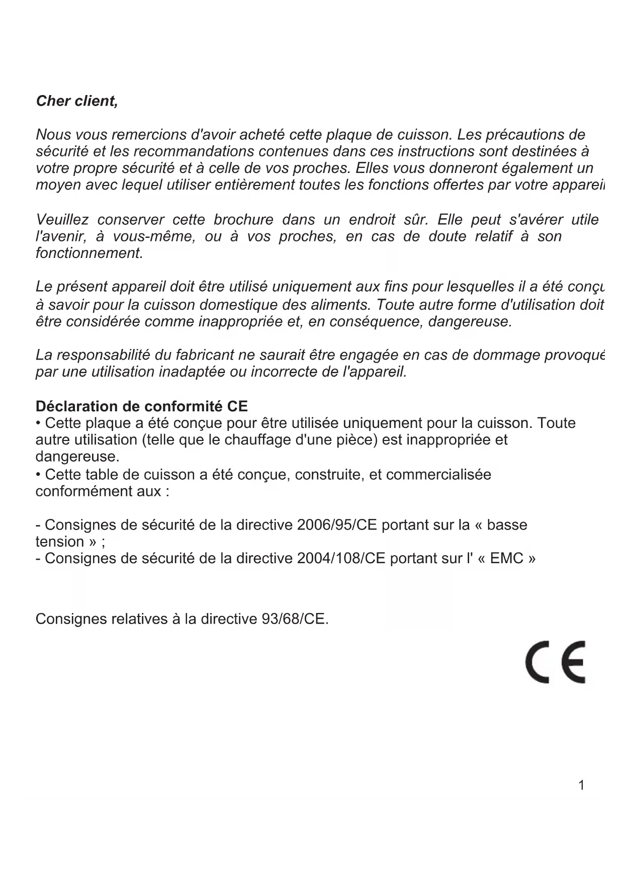 Nous vous remercions d'avoir acheté cette plaque de cuisson. Les précautions de sécurité et les recommandations contenues dans ces instructions sont destinées à votre propre sécurité et à celle de vos proches. Elles vous donneront également un moyen avec lequel utiliser entièrement toutes les fonctions offertes par votre appareil. Veuillez conserver cette brochure dans un endroit sûr. Elle peut s'avérer utile à l'avenir, à vous-même, ou à vos proches, en cas de doute relatif à son fonctionnement. Le présent appareil doit être utilisé uniquement aux fins pour lesquelles il a été conçu, à savoir pour la cuisson domestique des aliments. Toute autre forme d'utilisation doit être considérée comme inappropriée et, en conséquence, dangereuse. La responsabilité du fabricant ne saurait être engagée en cas de dommage provoqué par une utilisation inadaptée ou incorrecte de l'appareil. Déclaration de conformité CE