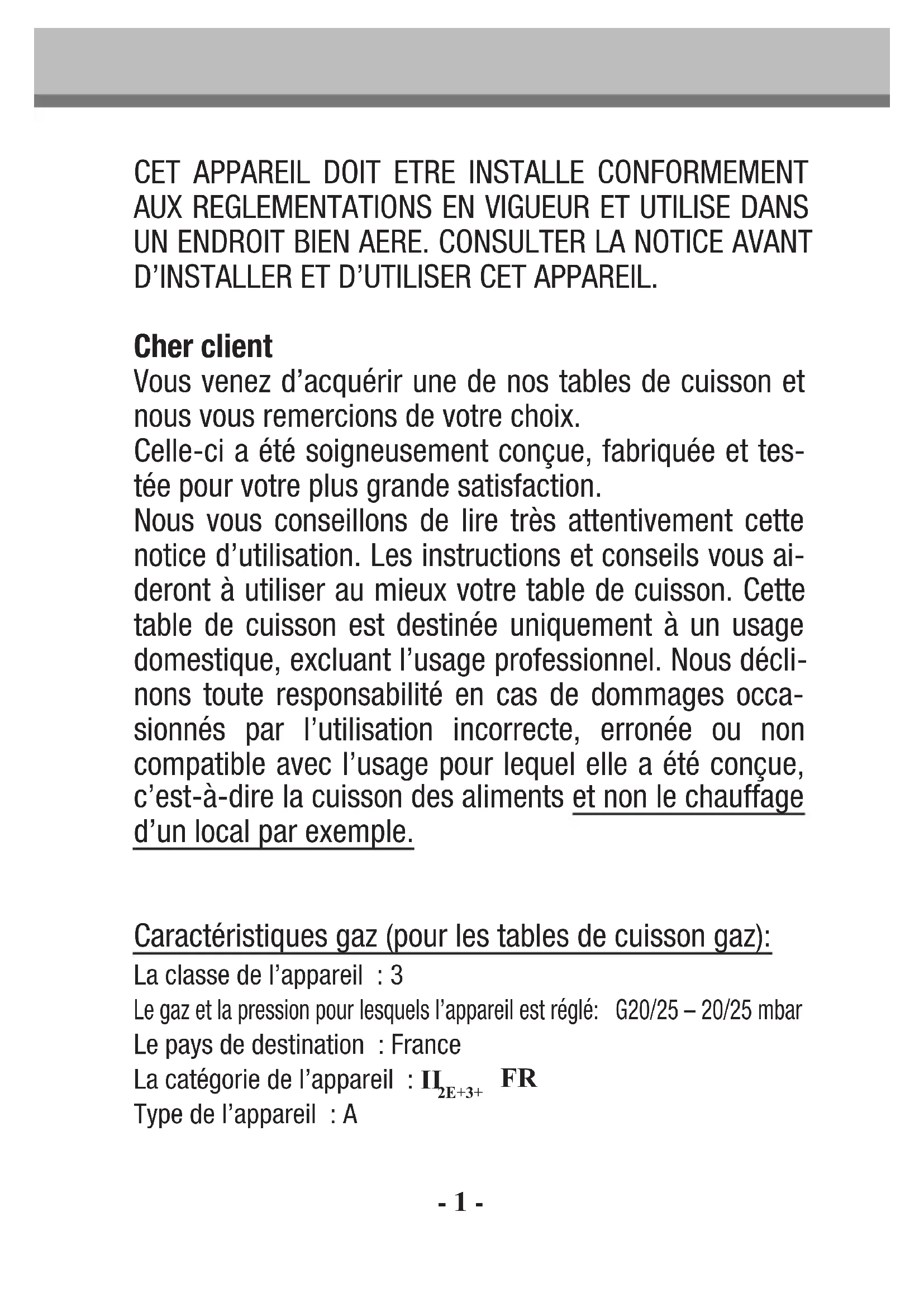 AUX REGLEMENTATIONS EN VIGUEUR ET UTILISE DANS UN ENDROIT BIEN AERE. CONSULTER LA NOTICE AVANT D’INSTALLER ET D’UTILISER CET APPAREIL. Cher client Vous venez d’acquérir une de nos tables de cuisson et nous vous remercions de votre choix. Celle-ci a été soigneusement conçue, fabriquée et tes- tée pour votre plus grande satisfaction. Nous vous conseillons de lire très attentivement cette notice d’utilisation. Les instructions et conseils vous ai- deront à utiliser au mieux votre table de cuisson. Cette table de cuisson est destinée uniquement à un usage domestique, excluant l’usage professionnel. Nous décli- nons toute responsabilité en cas de dommages occa- sionnés par l’utilisation incorrecte, erronée ou non compatible avec l’usage pour lequel elle a été conçue, c’est-à-dire la cuisson des aliments et non le chauffage d’un local par exemple. Caractéristiques gaz (pour les tables de cuisson gaz): La classe de l’appareil : 3 Le gaz et la pression pour lesquels l’appareil est réglé: G20/25 – 20/25 mbar Le pays de destination : France La catégorie de l’appareil : II 2E+3+