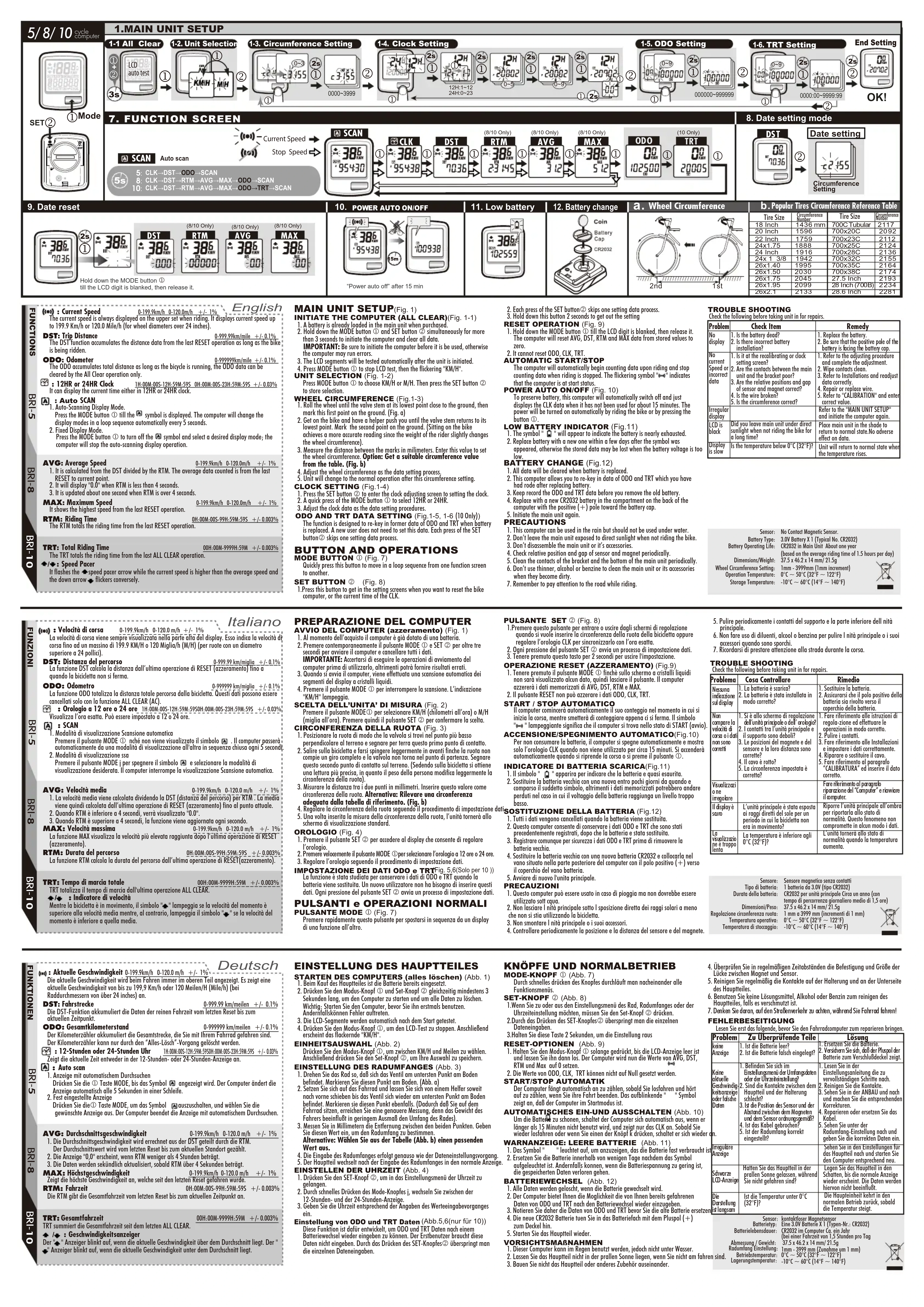 Batterie zum Verschlußdeckel zeigt.1. Lesen Sie in der Einstellungsanleitung die zu vervollständigen Schritte nach.2. Reinigen Sie die Kontakte.3. Sehen Sie in der ANBAU und nach und machen Sie die entsprechenden Korrekturen.4. Reparieren oder ersetzen Sie das Kabel.5. Sehen Sie unter der Radumfang-Einstellung nach und geben Sie die korrekten Daten ein.Sehen Sie in den Einstellungen für das Hauptteil nach und starten Sie den Computer entsprechend neu.Legen Sie das Hauptteil in den Schatten, bis die normale Anzeige wieder erscheint. Die Daten werden hiervon nicht beeinflußt.Die Haupteinheit kehrt in den normalen Betrieb zurück, sobald die Temperatur steigt.FEHLERBESEITIGUNG Lesen Sie erst das folgende, bevor Sie den Fahrradcomputer zum reparieren bringen.Problem Zu Überprüfende Teile Lösung(10 Only)(8/10 Only) (8/10 Only)(8/10 Only)(8/10 Only)(8/10 Only)(8/10 Only)BRI-8BRI-10BRI-5BRI-8BRI-5BRI-8BRI-10BRI-5BRI-8BRI-10BRI-5BRI-8BRI-10BRI-5 : Vitesse actuelle 0-199.9km/h 0-120.0m/h +/- 1% La vitesse actuelle est toujours affichée dans la partie supérieure de l’écran lorsqu’on roule. La vitesse s’affiche jusqu’à 199.9 KM/H ou 120.0 M/H (pour des roues dont le diamètre est supérieur à 24 pouces). DST: Distance de la randonnée 0-999.99km/miles +/- 0.1% La fonction DST totalise la valeur de la distance depuis la dernière remise à zéro (RESET) aussi longtemps que le vélo roule. ODO: Odomètre 0-999999km/miles +/- 0.1% La fonction ODO permet de calculer la distance totale parcourue. Les données de l'odomètre peuvent uniquement être effacées en effectuant un effacement complet. : Horloge à affichage 12 h ou 24 h1H:00M:00S-12H:59M:59S0H:00M:00S-23H:59M:59S +/- 0.03% L’heure peut être affichée en mode 12 h ou 24 h. : SCAN1. Scan auto. du mode d'affichage Appuyez sur le bouton de MODE jusqu'à ce que le symbole s'affiche. L'ordinateur passera automatiquement d'un mode d'affichage au suivant toutes les 5 secondes.2. Mode d'affichage fixe Appuyez sur le bouton de MODE pour désactiver le symbole et sélectionner le mode d'affichage souhaité ; l'ordinateur arrêtera la fonction de scan automatique de l'affichage. AVG: Vitesse moyenne 0-199.9km/h 0-120.0m/h +/- 1% 1. Cette valeur provient de la division de la distance (DST) par le temps (RTM). La valeur moyenne calculée se fait à partir de la dernière remise à zéro (RESET) jusqu’au point actuel. 2. La vitesse moyenne est de "0.0" si RTM est inférieur à 4 secondes.3. La vitesse moyenne est mise à jour à peu près à chaque seconde si RTM est supérieur à 4 secondes. MAX: Vitesse maximale 0-199.9km/h 0-120.0m/h +/- 1% La vitesse la plus élevée atteinte depuis la dernière remise à zéro (RESET) est affichée.RTM: Durée de la randonnée 0H:00M:00S-99H:59M:59S +/- 0.003% La fonction RTM totalise la durée de la randonnée depuis la dernière remise à zéro (RESET). TRT: Durée totale de sortie 00H:00M-9999H:59M +/- 0.003% La fonction TRT enregistre la durée totale de la sortie lorsqu’on roule sur le vélo. / : Écart de vitesse La flèche d’écart de vitesse " " clignote si la vitesse actuelle est supérieure à la vitesse moyenne, tandis que la flèche d’écart de vitesse " " clignote si la vitesse actuelle est inférieure à la vitesse moyenne tant que le vélo roule.FrançaisRÉGLAGE DE L’UNITÉ PRINCIPALE INITIALISER LE CYCLOMÈTRE (effacement des données) (Fig. 1)