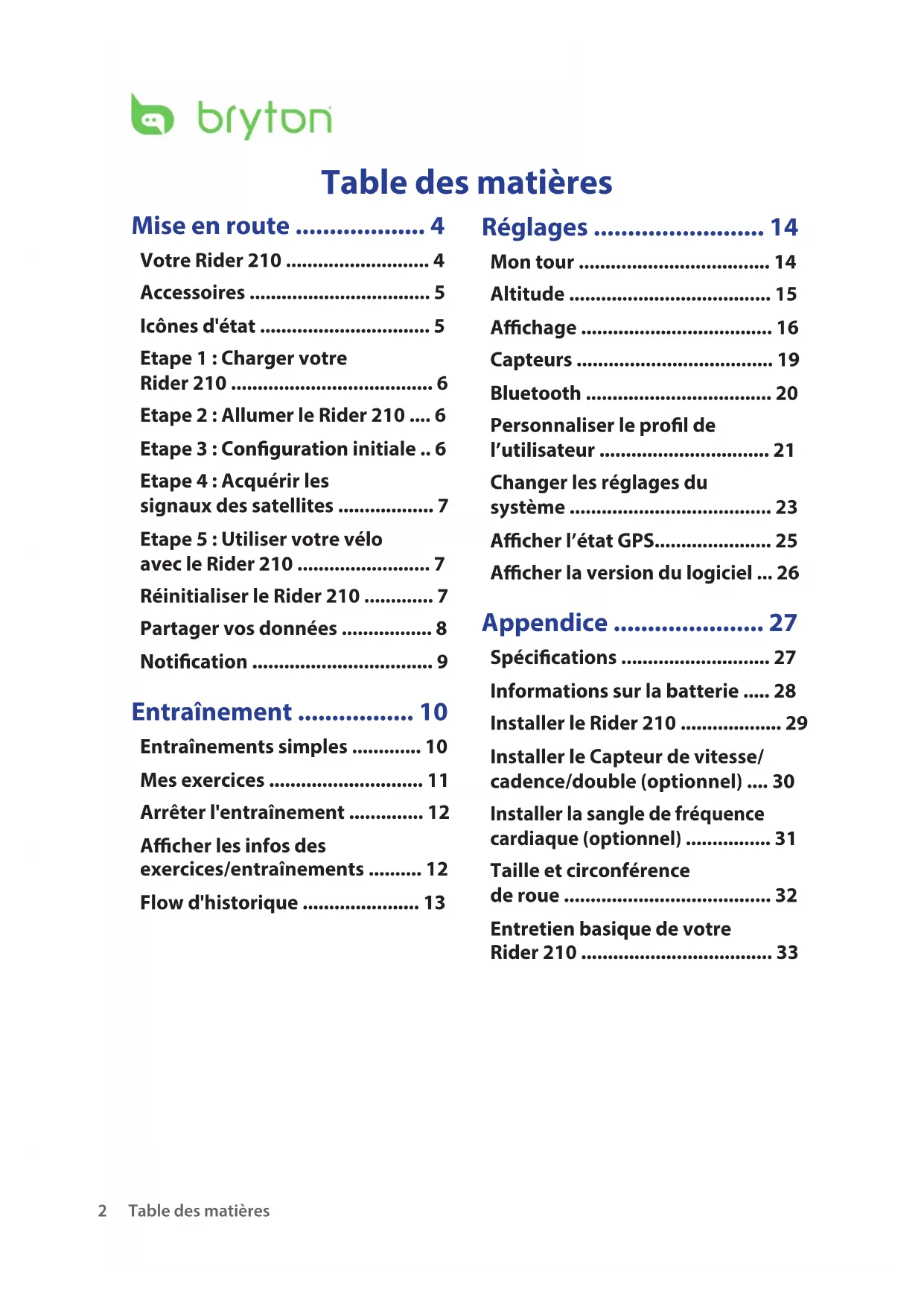 Taille et circonférence de roue ....................................... 32 Entretien basique de votre Rider 210 .................................... 33 Table des matièresFRANÇAIS Mise en route 3 AVERTISSEMENT Consultez toujours un docteur avant de commencer ou de modier un programme d'entraînement. Pour plus de détails, veuillez lire le guide Garantie et informations de sécurité dans la boîte. Enregistrement du produit Aidez-nous à vous aider, en remplissant le formulaire d'enregistrement de votre appareil en utilisant Bryton Bridge. Visitez http://support.brytonsport.com pour plus d'informations. Logiciel Bryton Visitez http://brytonsport.com pour télécharger le logiciel libre pour téléverser votre prol personnel, suivre et analyser vos données sur le Web. Loi des droits de consommateur de l'Australie Nos produits viennent avec des garanties qui ne peuvent pas être exclues en vertu des Loi des droits de consommateur de la Nouvelle-Zélande et de l'Australie. Vous avez droit à un remplacement ou un remboursement en cas d'un échec majeur et d'une compensation pour toute autre perte ou dommage raisonnablement prévisible. Vous avez également le droit d'avoir les produits réparés ou remplacés si les produits ne sont pas d'une qualité acceptable et si la panne ne constitue pas une défaillance majeure.Mise en route
