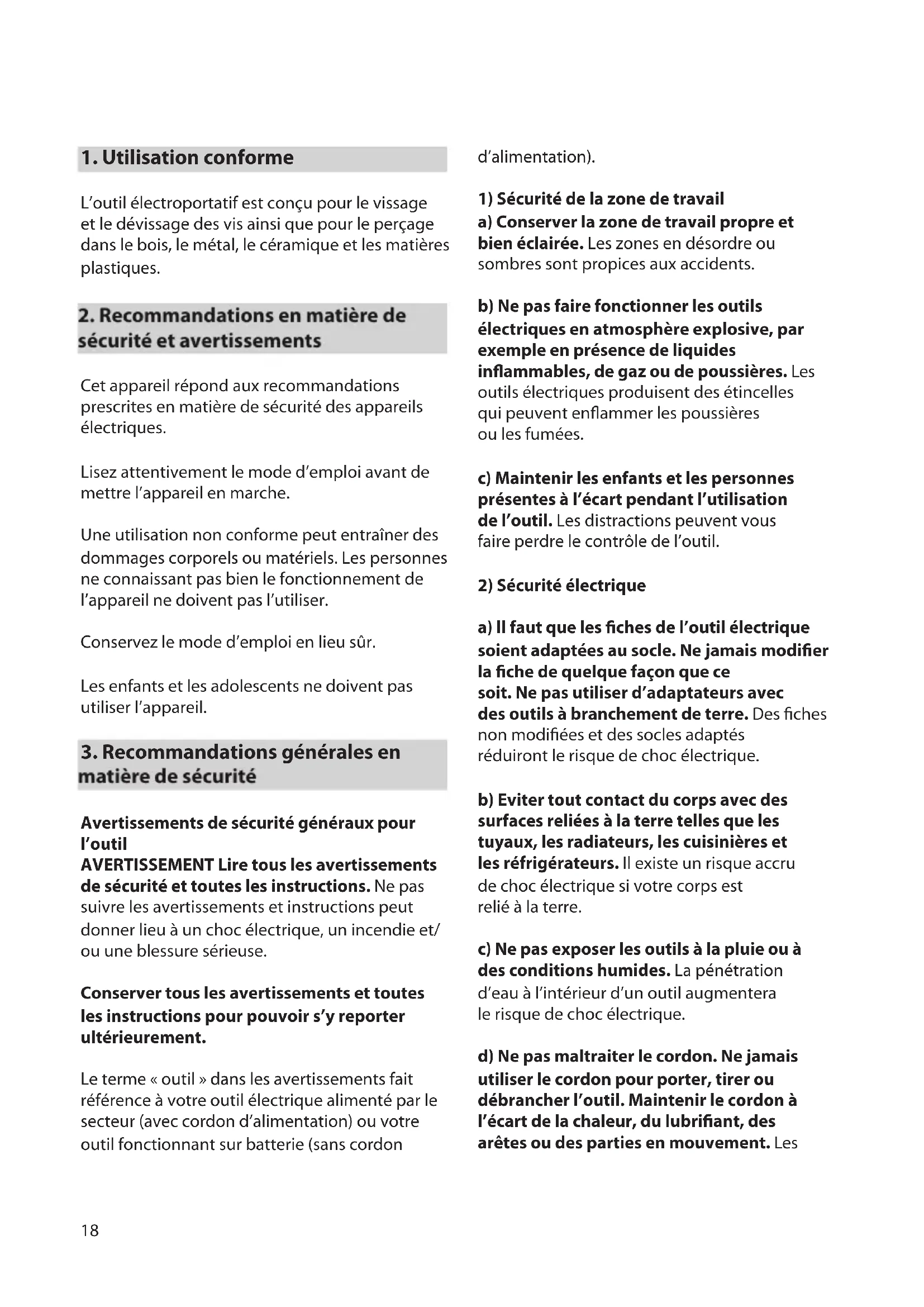 L'outil electroportatif est concu pour le vissage et le devissage des vis ainsi que pour le perçage dans le bois, le métal, le céramique et les matières plastiques.