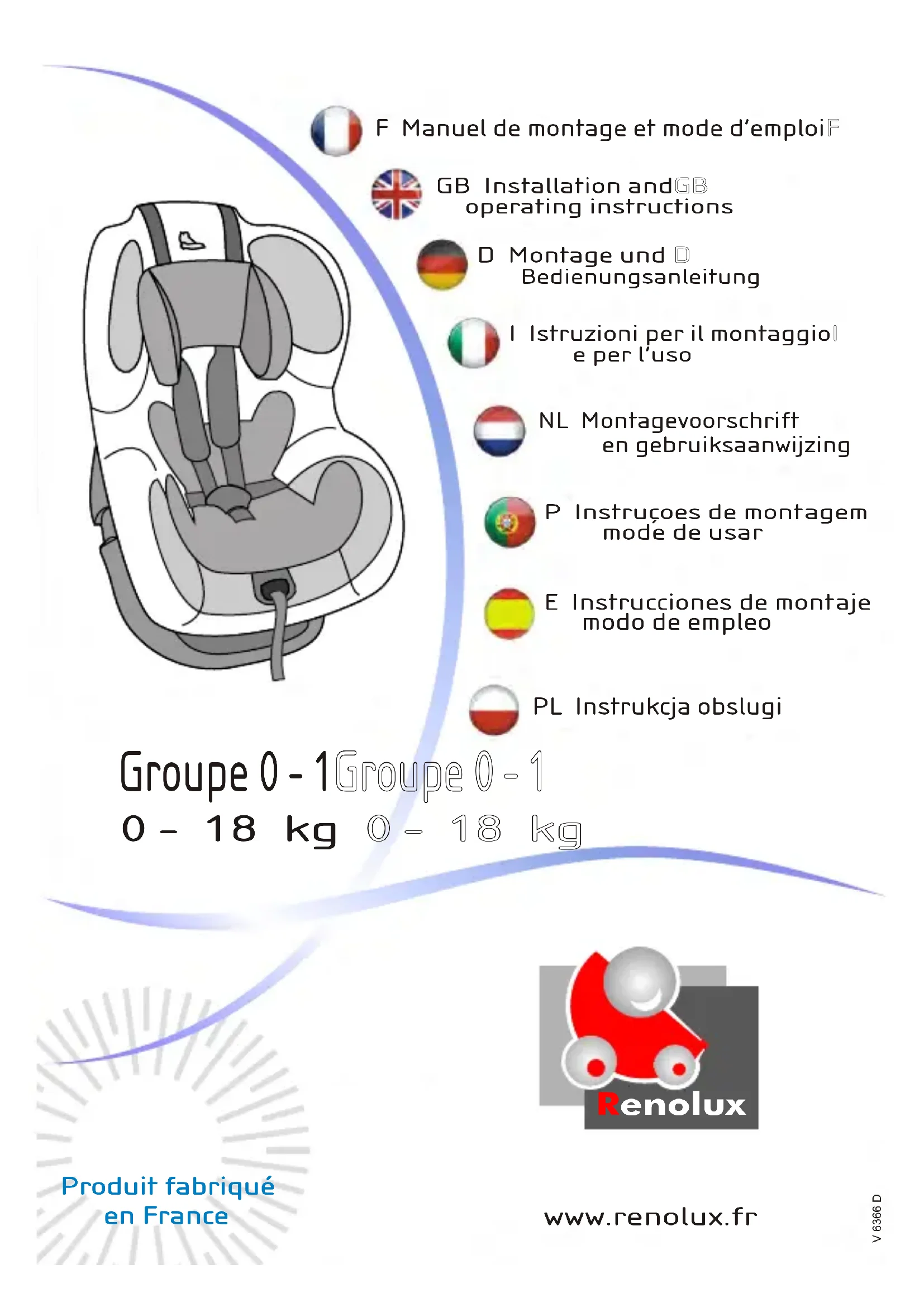 « Lire attentivement les instructions avant utilisation et conserver la notice pour les futurs besoins de référence.» Conforme aux exigences de sécurité. Ne peut être installé que dans les véhicules équipés de ceintures de sécurité trois points conformes au règlement CEE n°16 ou à d'autres normes équivalentes. Ne jamais utiliser de dispositif de retenue : - ne correspondant pas au poids et à la morphologie de l'enfant. - d'une autre façon que celle prévue par le fabricant (respecter les instructions de montage). - ayant subi un accident : il est nécessaire de le remplacer car il peut présenter des dégâts non perceptibles par l'utilisateur. Installer systématiquement votre enfant dans le siège de sécurité, y compris pour les trajets courts. « Avertissement ! Il peut être dangereux de laisser l'enfant sans surveillance. » Au cours du voyage, s'assurer que votre enfant reste toujours correctement installé. Les sangles doivent être maintenues tendues et non vrillées. Régler systématiquement le harnais et veiller à ce que les sangles sous-abdominales soient portées aussi bas que possible pour bien maintenir le bassin. Veillez à ce que les bagages et objets susceptibles de causer des blessures en cas de choc soient correctement arrimés. Il est recommandé de ne pas utiliser le dispositif sans sa housse et de ne pas la remplacer par une autre que celle recommandée par le constructeur. Les éléments rigides et les pièces plastiques du dispositif doivent être situés et installés de telle manière qu'ils ne puissent pas, dans des conditions normales d'utilisation du véhicule, se coincer sous un siège mobile ou dans la porte du véhicule. La sécurité du dispositif n'est garantie que si le siège est monté et utilisé conformément aux instructions de la notice : toute modification de l'usage, du montage ou de la composition peut diminuer la sécurité du dispositif. Ce siège auto est utilisable pour les enfants jusqu'à 18 kg dans tous les véhicules dont les ceintures 3 points répondent aux exigences des normes européennes en vigueur. Possibilités d'utilisation de votre Siège Auto : Groupe 0 (jusqu’à 10kg) : Siège auto avec harnais installé dos à la route aux places arrière munies d'une ceinture3 points ou sur le siège avant passager. Utilisation d’un réducteur adapté aux petits enfants. Groupe 1 (9 - 18kg): Siège auto avec harnais installé face à la route aux places arrière munies d'une ceinture 3 points. En cas de doute, n’hésitez pas à consulter le fabricant ou le revendeur du siège auto. CONSEILS D'ENTRETIEN Laver les parties textiles à la main avec une éponge et de l’eau savonneuse GARANTIE La société RENOLUX France Industrie garantit ce siège auto pendant 2 ans à dater de son achat. Toute utilisation non conforme à cette notice ne saurait engager la responsabilité de la société RENOLUX. Pour toute réclamation, retourner cette notice au magasin accompagné de son ticket de caisse. En cas de détérioration d'une housse, vous pouvez vous en procurer une nouvelle sur commande. Pour tout autre composant nécessitant un démontage, il est interdit de faire une réparation ou un changement soi-même. En particulier un siège ayant subi un accident de voiture ne doit pas être réutilisé. De même il est fortement déconseillé d'utiliser un siège acheté d'occasion dont on ne sait pas quelle utilisation en a été faite par l'acheteur précédent. FRANCAISENGLISH In case of doubt,do not hesitate to consult the manufacturer or the retailer of the car seat.