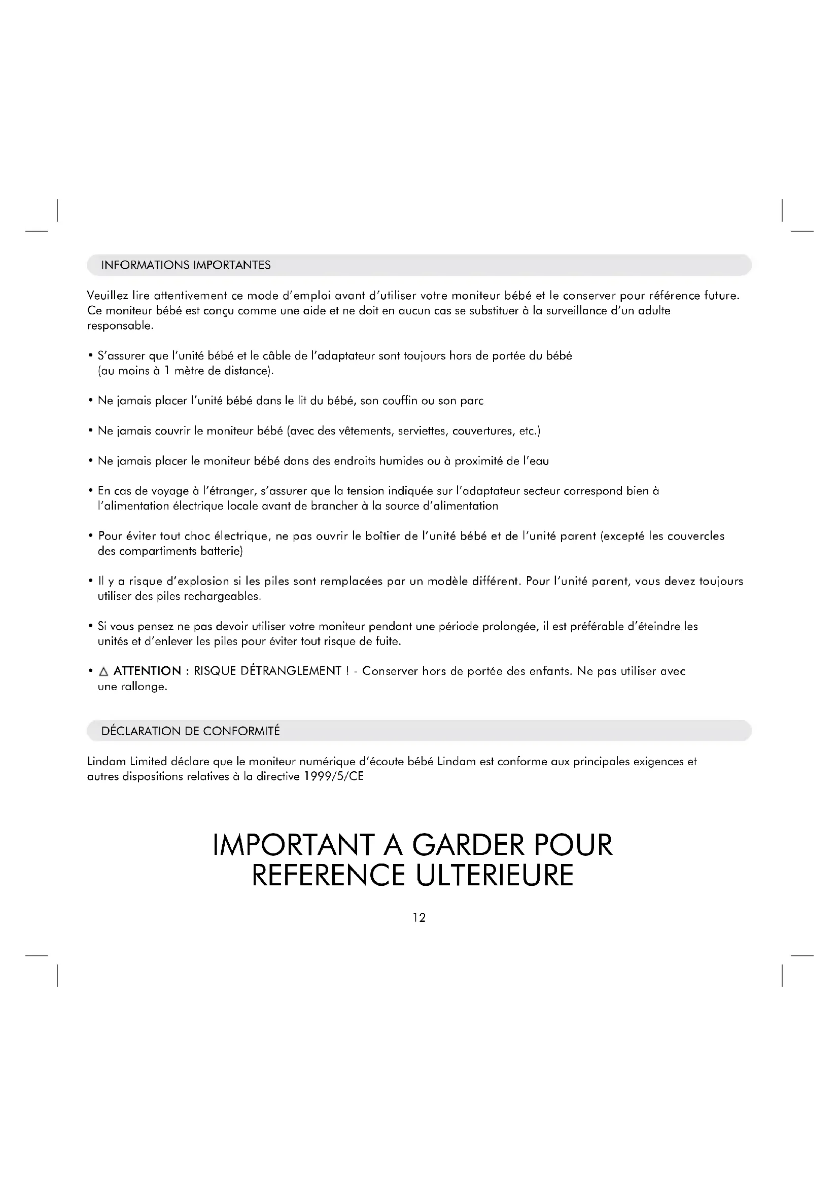Lindam Limited déclare que le moniter numérique d'écoute bébé Lindam est conforme aux principales exigences et autres dispositions relatives à la directive 1999/5/CE