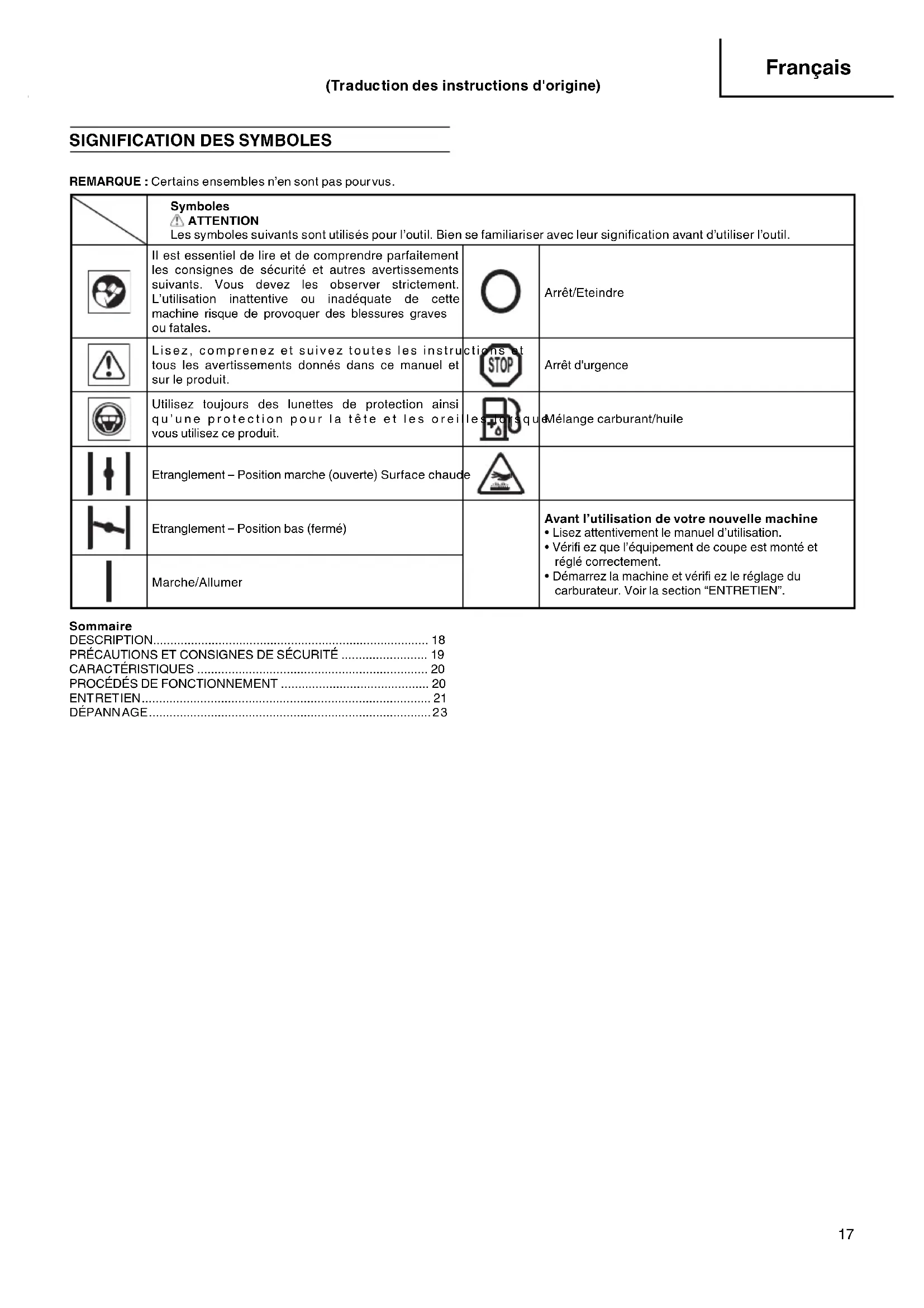 REMARQUE : Certains ensembles n’en sont pas pourvus. Symboles ATTENTION Les symboles suivants sont utilisés pour l’outil. Bien se familiariser avec leur signifi cation avant d’utiliser l’outil. II est essentiel de lire et de comprendre parfaitement les consignes de sécurité et autres avertissements suivants. Vous devez les observer strictement. L’utilisation inattentive ou inadéquate de cette machine risque de provoquer des blessures graves ou fatales. Arrêt/Eteindre Lisez, comprenez et suivez toutes les instructions et tous les avertissements donnés dans ce manuel et sur le produit. Arrêt d'urgence Utilisez toujours des lunettes de protection ainsi qu’une protection pour la tête et les oreilles lorsque vous utilisez ce produit. Mélange carburant/huile Etranglement – Position marche (ouverte) Surface chaude Etranglement – Position bas (fermé) Avant l’utilisation de votre nouvelle machine